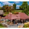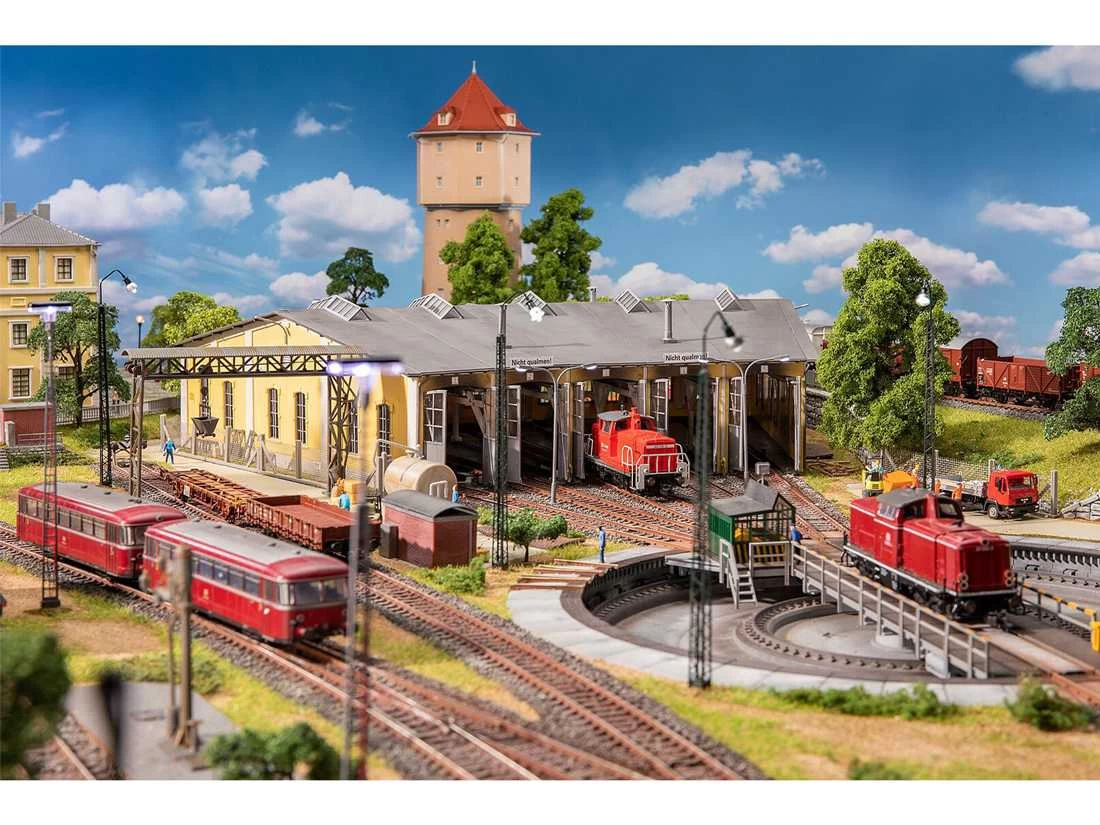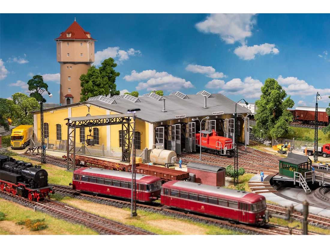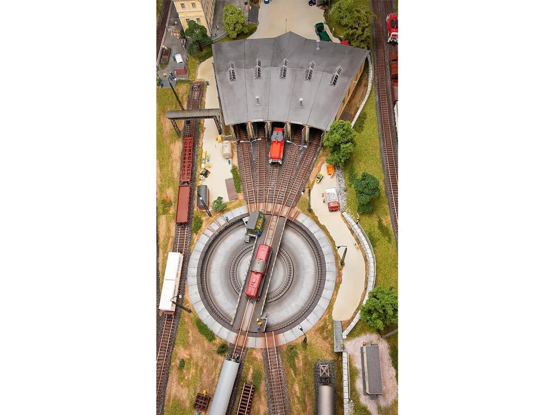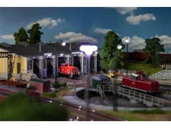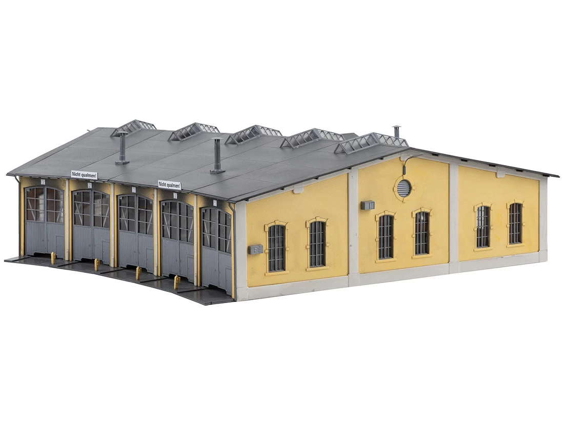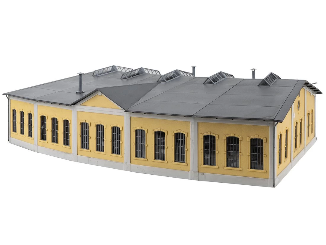 Modell: Spur H0. 5-teiliger, erweiterbarer Lokschuppen mit 7,5 Grad Teilung, Dachreitern und großen Seiten- und Rückfenstern nach dem denkmalgeschützten Original in Freilassing, Bayern. Servoantriebsteile für alle Tore im Bausatz enthalten. Unterstand bis zu einer Länge von 290 mm über Puffer. Patiniertes Modell. Der Bausatz enthält: 321 Bauteile in 6 Farben, Fensterfolie, 1 Decal und 1 Bauanleitung.