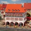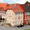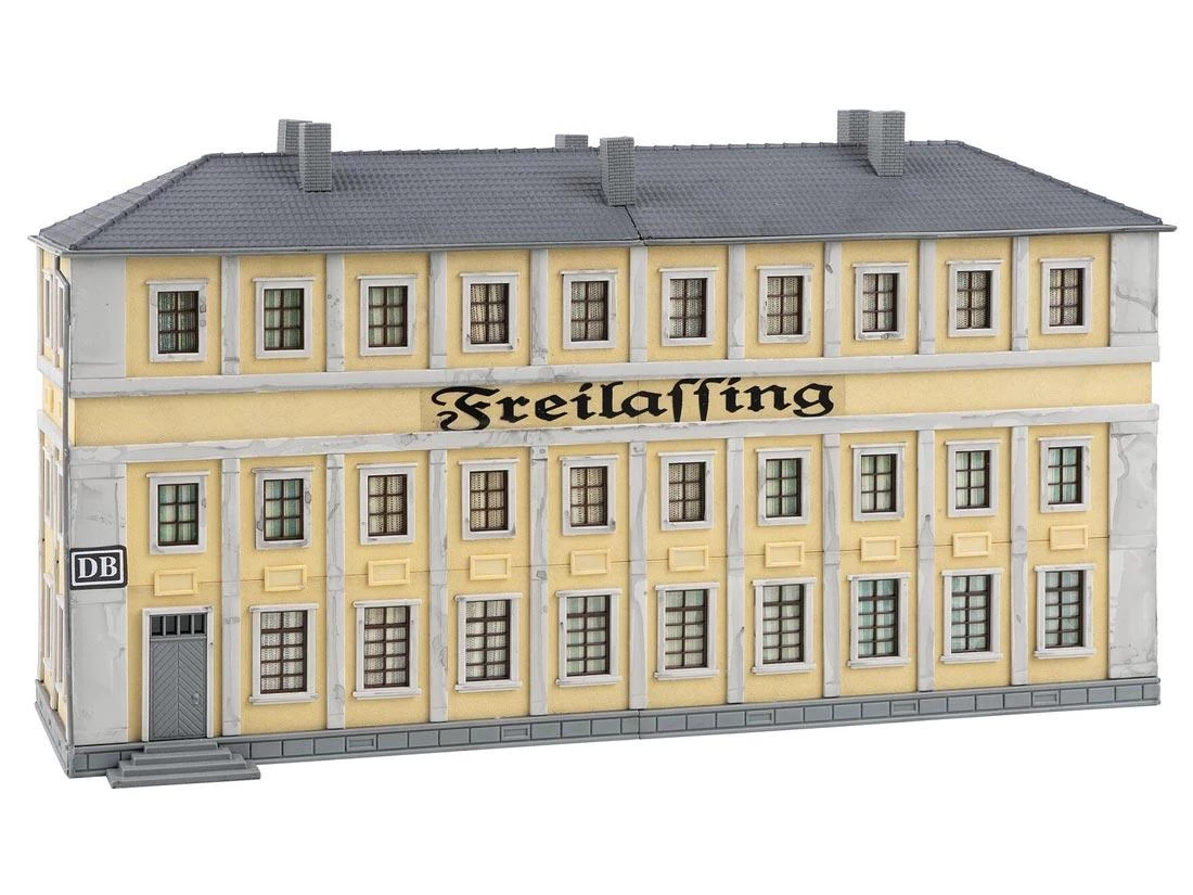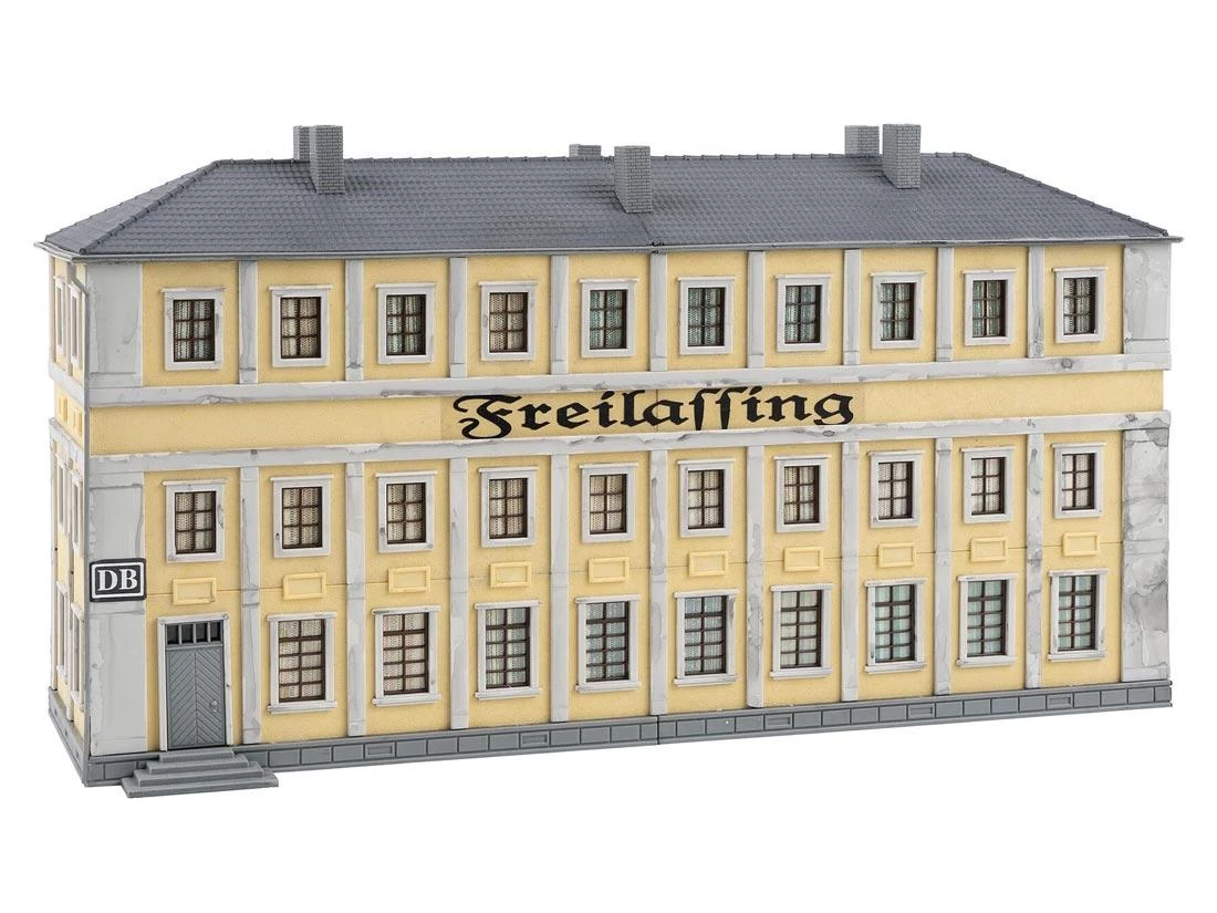 Modell: Spur H0. Patiniertes Modell eines dreigeschossigen Verwaltungsgebäudes mit gemauerten Fensterrahmungen und gliederndem Fassadendekor.