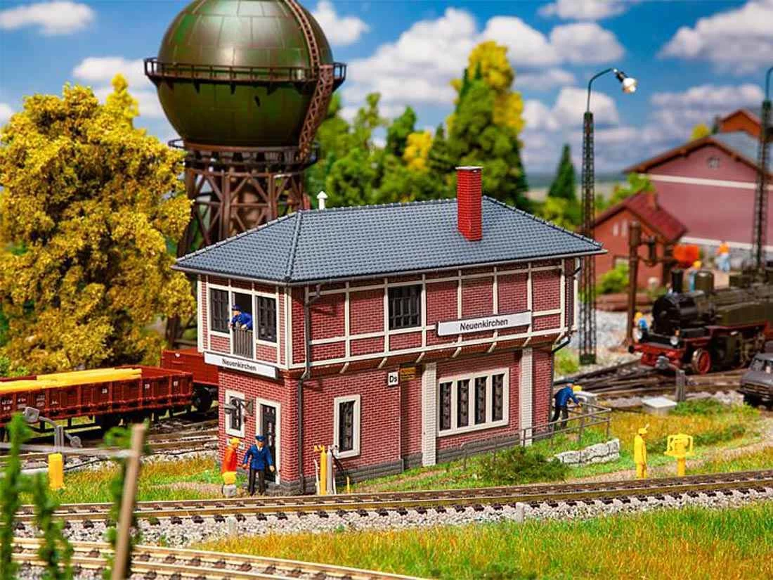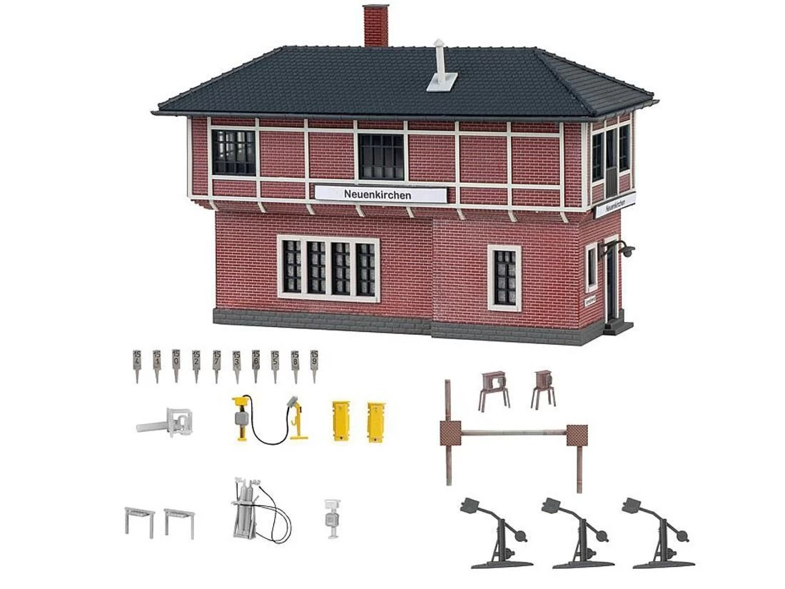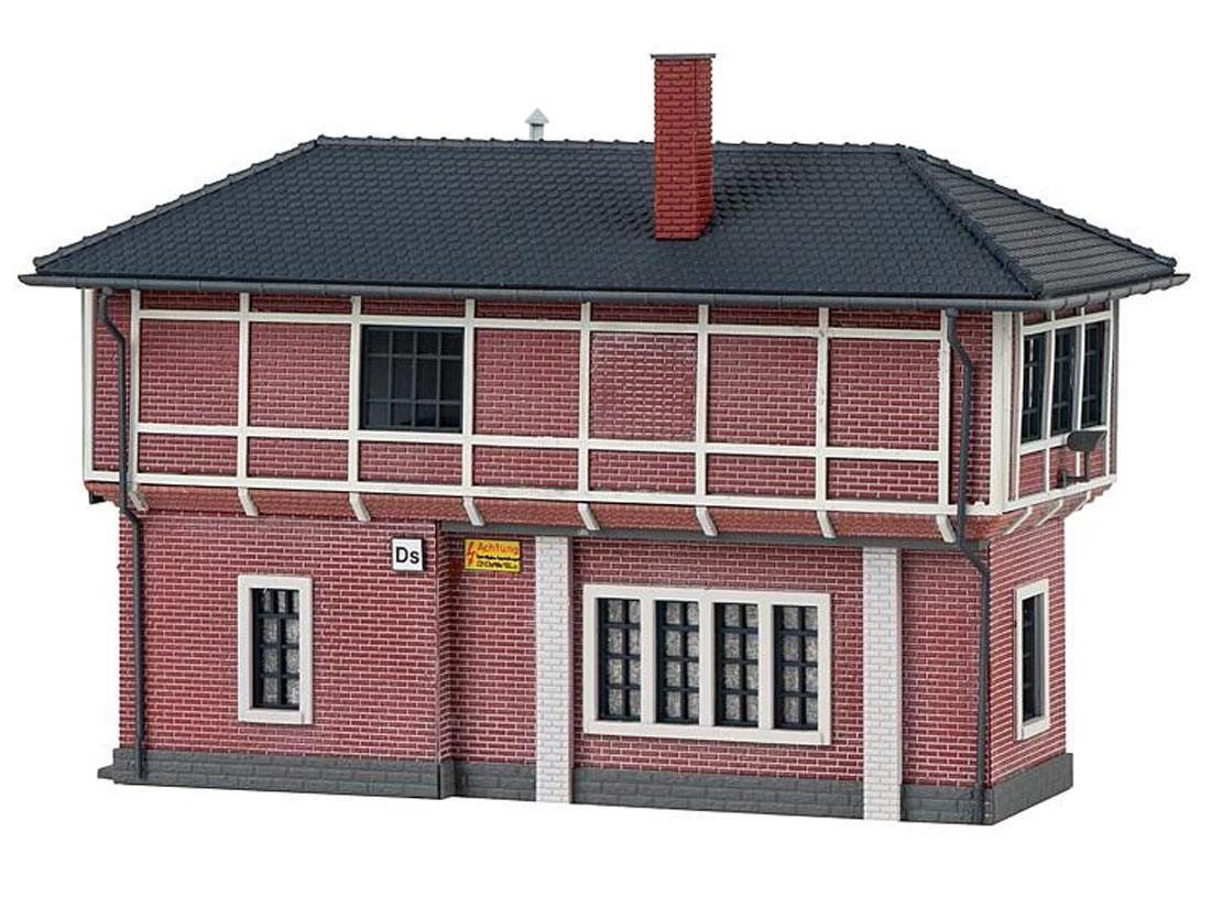 Modell: Spur H0. Zweigeschossiges Stellwerksgebäude in Ziegelbauweise. Für die Außenausschmückung liegen drei Weichenstellhebel, Tremolo, Hektometersteine und eine Zugvorheizanlage bei.