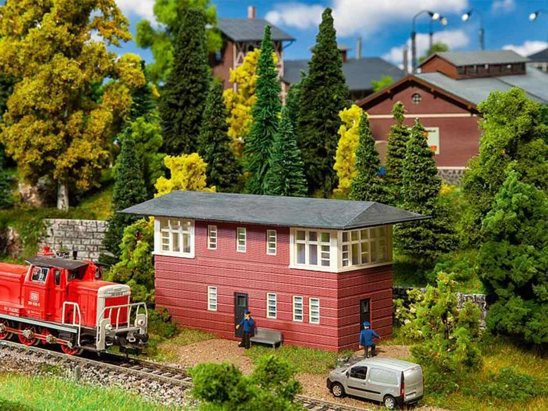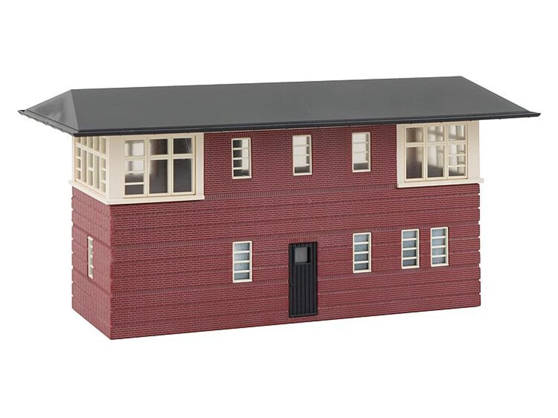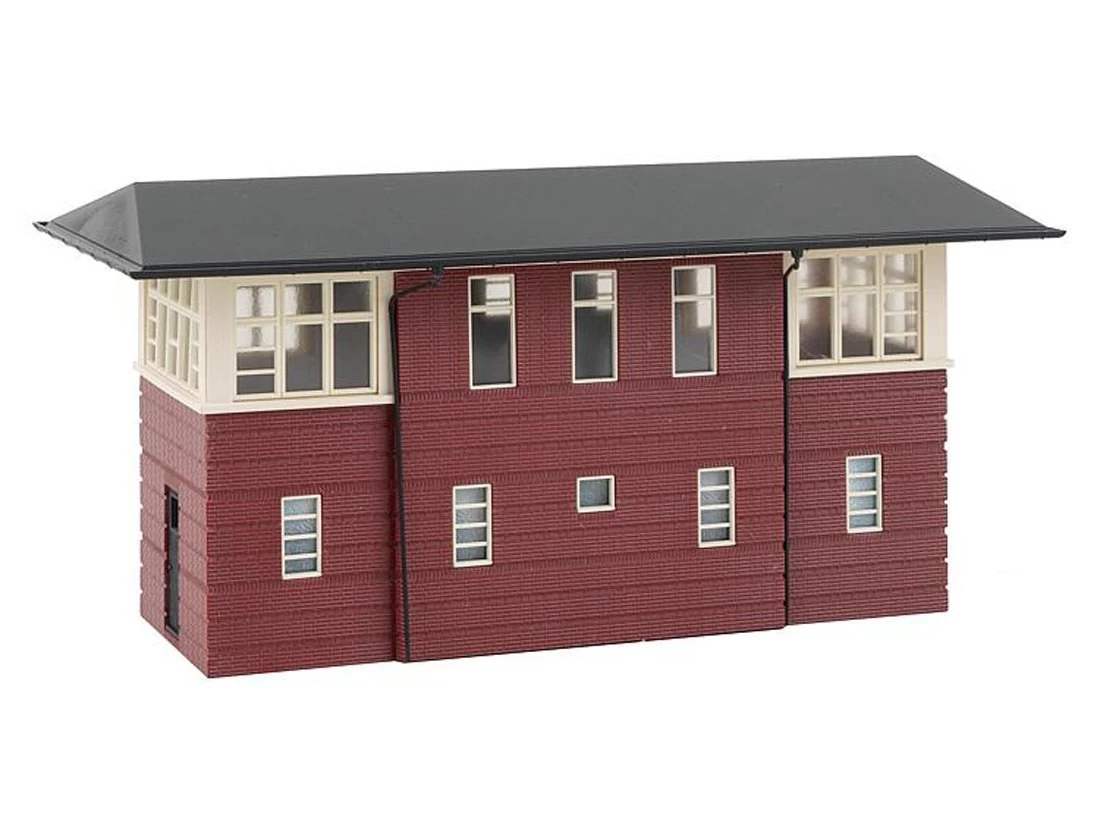 Modell: Spur H0. Zweigeschossiges, mechanisches Stellwerk mit dunkelroter Klinkerfassade und weiĂen Fensterrahmen unter einem flachen Satteldach mit Halbwalm.