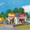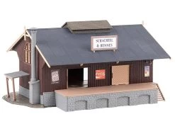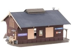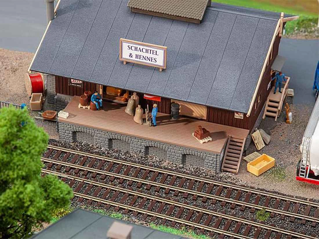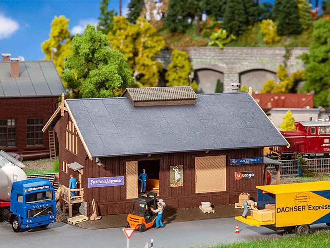 Modell: Spur H0. Güterschuppen in Holzbauweise mit gemauertem Fundament und einem weit herabgezogenen Satteldach, das die Arbeit an der Laderampe vor Witterungseinflüssen schützt. Vier große Schiebetore und ein Treppenaufgang ermöglichen den Zugang zum Schuppen.