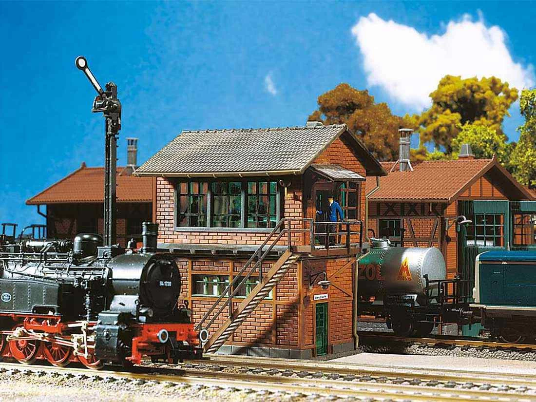 Modell: Spur H0. Stellwerk in Fachwerkbauweise, mit Außenaufgang und einigen typischen Einrichtungsteilen im oberen Stockwerk.