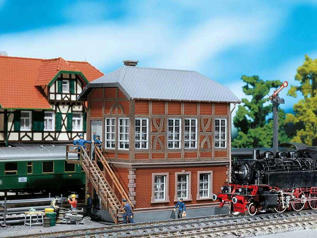 Modell: Spur H0. Stellwerk in Ziegelbauweise, Schieferverkleidung und Fachwerk im oberen Stellwerksbereich.