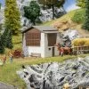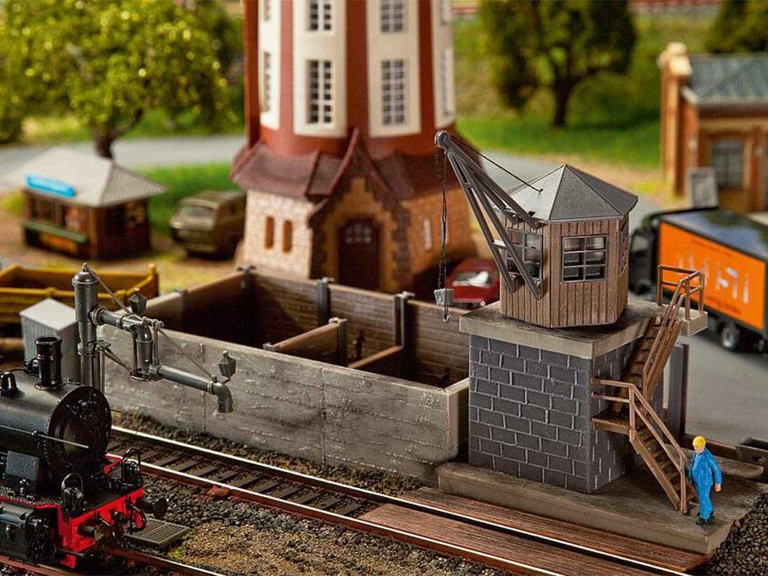 Modell: Spur H0. Bw-Set bestehend aus einem beweglichen Verladekran, zwei beheizbaren Gelenkwasserkränen mit flexiblen Auslegern und Wasserabflüssen sowie einer Kleinbekohlung mit Kohlehunten und ortsfestem, beweglichem Kran. Der Bausatz enthält Antriebsteile für alle Modelle sowie einen Servo. Gleichzeitiger Antrieb von bis zu vier Modellen bei Zukauf von weiteren Servos möglich.