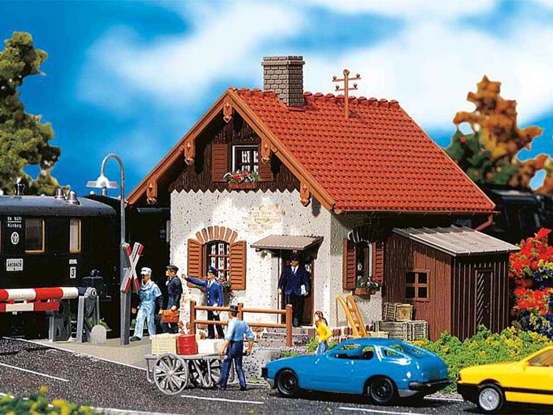 Modell: Spur H0. Bahnwärterhäuschen mit seitlich angebautem Schuppen und Bretterverschalung im Dachgeschoss.