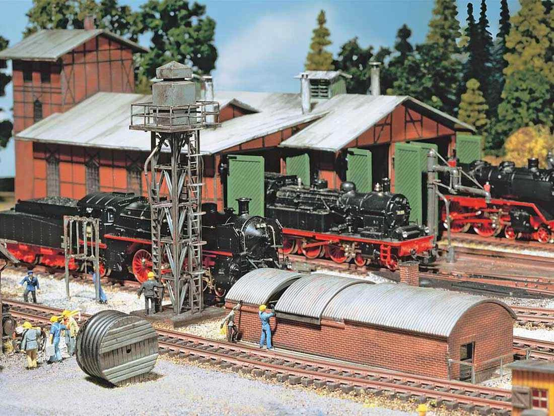 Modell: Spur H0. Ein vorbildgetreues Modell in filigraner Stahlkonstruktion mit Sand-Hochbehälter. Für die interessante Kombination mit einem weiteren Besandungsturm liegt dem Bausatz ein Brückenübergangsteil bei (wie 120146).