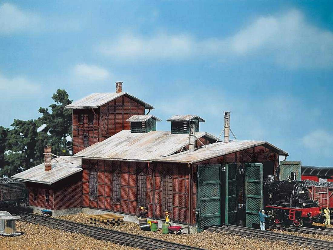 Modell: Spur H0. Lokschuppen mit 2 Unterständen für Loks bis 190 mm LüP. Die Tore können manuell geöffnet und geschlossen werden.