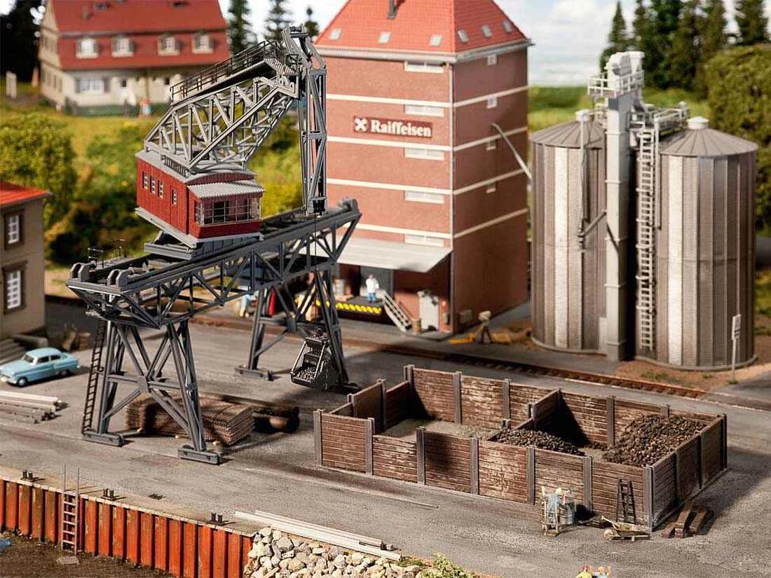 Modell: Spur H0. Der ideale Drehkran für Be- und Entladearbeiten im Hafen, im Bahnbereich, im Industriegebiet etc. Das Kranoberteil kann manuell um 360° gedreht werden (Motor nicht nachrüstbar). Auf der beigefügten Gleisattrappe lässt sich die Kranbrücke manuell verschieben. Der Kran ist wahlweise mit einfachem Kranhaken, schwerem Doppelhaken, Greiferschaufel oder Holzgreifer ausgerüstet. In der Packung sind zusätzlich Kohlebansen enthalten, in denen diverse Kohlensorten und andere Schüttgutmaterialien gelagert werden können. Somit kann eine schöne Gesamtszenerie gebaut werden.