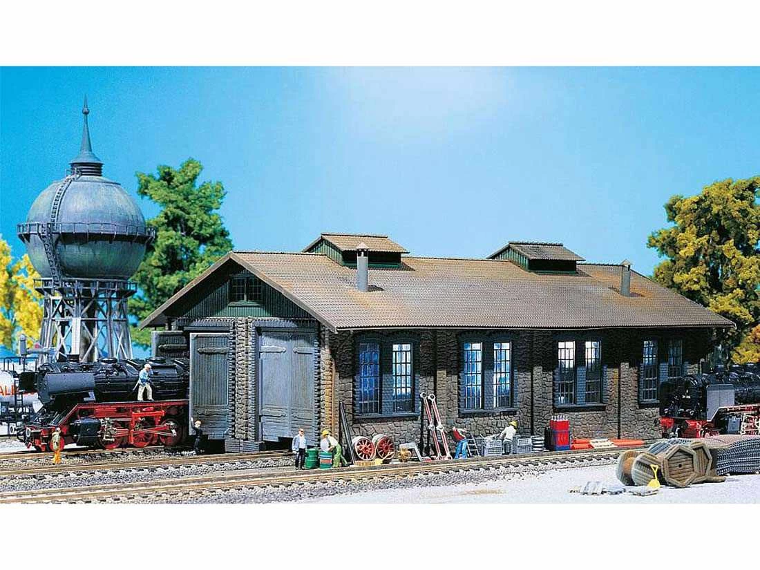 Modell: Spur H0. Lokschuppen in Ziegelbauweise, mit 2 Unterständen für Loks bis zu 270 mm LÜP. Die Tore verfügen über Federn, die diese nach dem Durchfahren einer Lok automatisch wieder schließen. Oberleitungsbetrieb möglich.