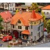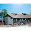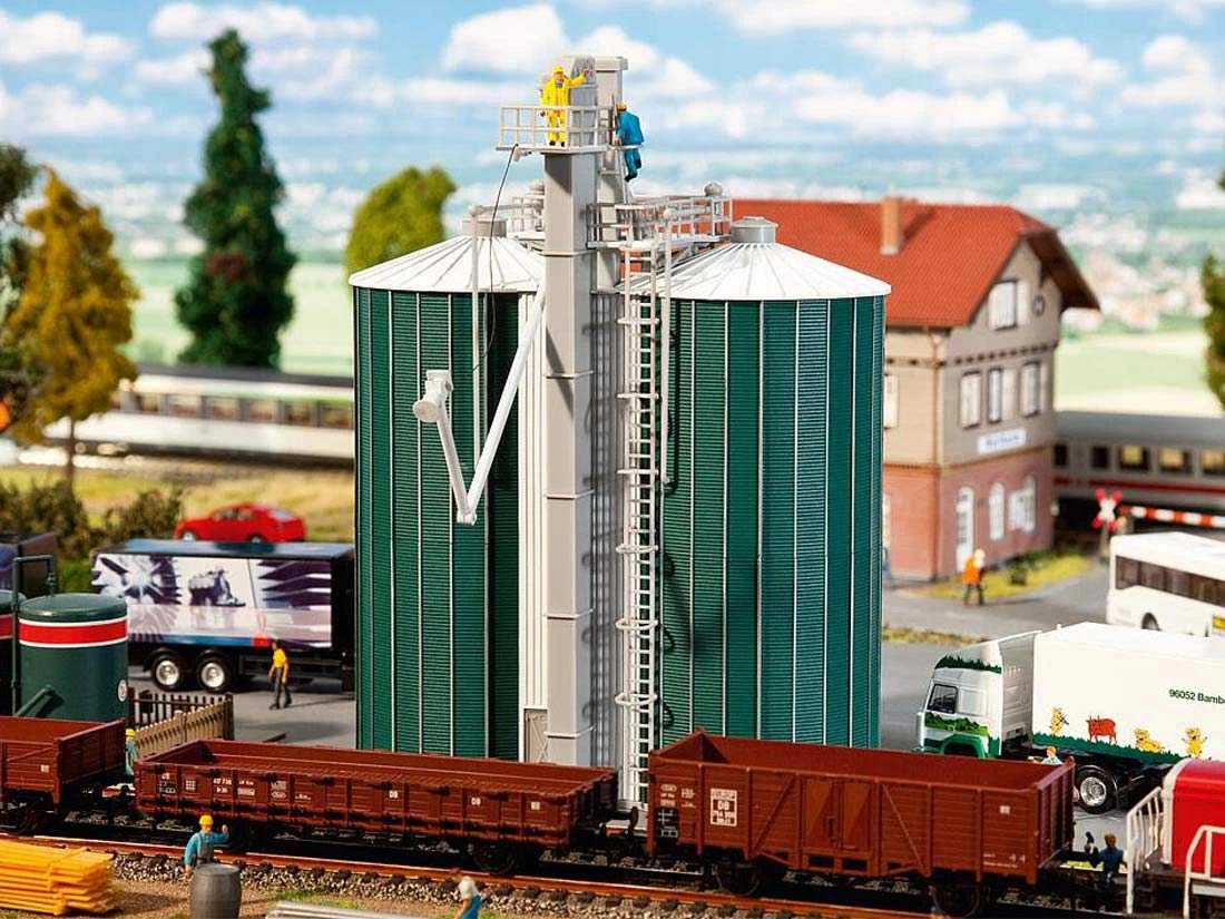 Modell: Spur H0. Zwei zylindrische Hochsilos mit großem Fassungsvermögen für die Lagerung und den Umschlag von Schüttgut. Die Beförderung erfolgt über Rohrleitungen. Begehbar über Außenleiter und Laufsteg mit Geländer.