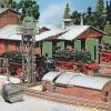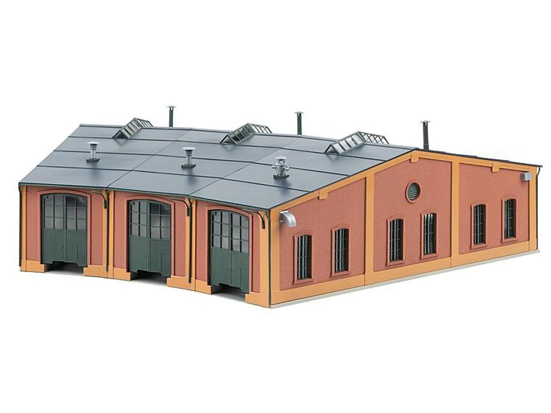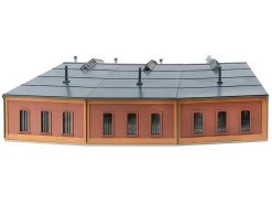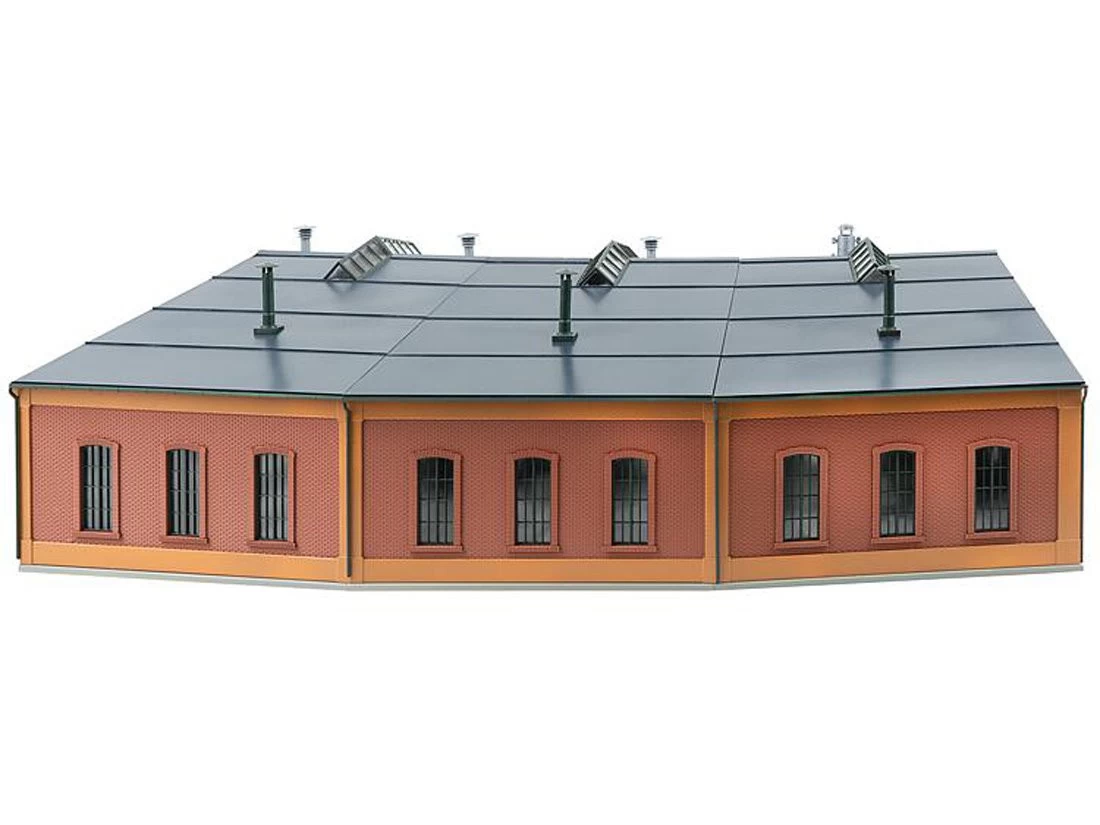 Modell: Spur H0. Für die Stationierung Ihrer Loks. 3-ständiges, erweiterbares Lok-Ringdepot für die Angliederung an Drehscheiben mit einem Abgangswinkel von 12°. Tragwerk und Sichtmauerwerk des Backsteinbaus sind farblich abgesetzt. Die Seitenwände sind mit je sieben Fenstern und jeder Schuppenstand mit drei rückwärtigen Fenstern, Rauchabzug, Oberlicht und Schornsteinkopf ausgestattet. Antriebsteile und Anlenkdraht für die Bewegung der Tore mit einem Servo enthalten (Servo, Art. 180726 separat erhältlich). Unterstand bis 290 mm LüP. Torhöhe SUK: 72 mm. Modell für alle herkömmlichen Gleissysteme geeignet. Erweiterbar mit Ergänzungs-Set für Ringlokschuppen mit 12°-Teilung, Art. 120282. Für einen Halbkreisschuppen benötigen Sie: 1 x Art. 120281, 6 x Art. 120282.
