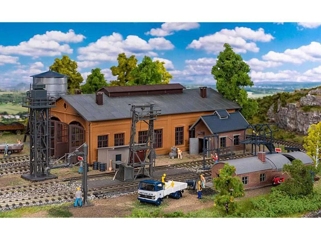 Modell: Spur H0. Umfangreiches Modell-Set fĂŒr die Bw-Ausgestaltung bestehend aus: einer Ausschlackanlage mit Grube und SchrĂ€gaufzug, einem Kompressorhaus mit Innenausstattung und einem Sandhaus mit schiebbarem Tonnendach, beide GebĂ€ude in BacksteinausfĂŒhrung, einem Stahl-Sandturm mit HochbehĂ€lter, einem RohrblasgerĂŒst und einem SchĂŒrhakengestell mit HandgerĂ€ten, einem Schuppen mit Vordach sowie einem Wasserkran mit schwenkbarem Gelenkausleger, Beheizungsanlage und Gullygittern. Servomontageteile fĂŒr den Antrieb der Aussschlackanlage und des Wasserkrans sowie 1 Servo, Art. 180726 beiliegend. Um beide Modelle anzutreiben, wird ein zweiter Servo, Art. 180726, nicht beiliegend, benötigt. Verwenden Sie fĂŒr den Anschluss die Servosteuerung, Art. 180725, nicht beiliegend.