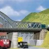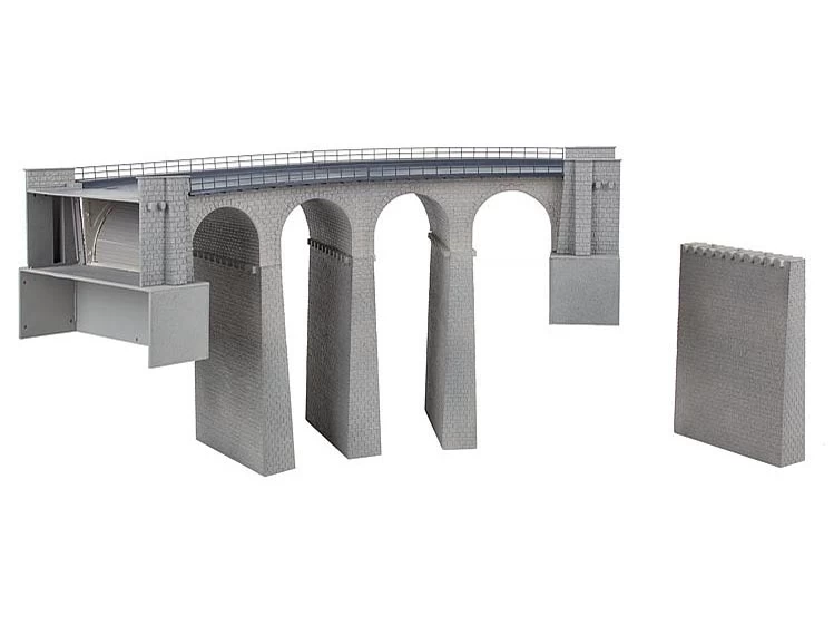 Modell: Spur H0. Set bestehend aus einer gebogenen Viaduktbrücke mit Gleisbett und hohen Pfeilern. Eine Brückenkopfgarnitur und ein zusätzlicher Pfeiler zur Verlängerung der Brücke liegen dem Bausatz bei. Geeignet für Märklin C-Gleis und alle anderen Gleise.