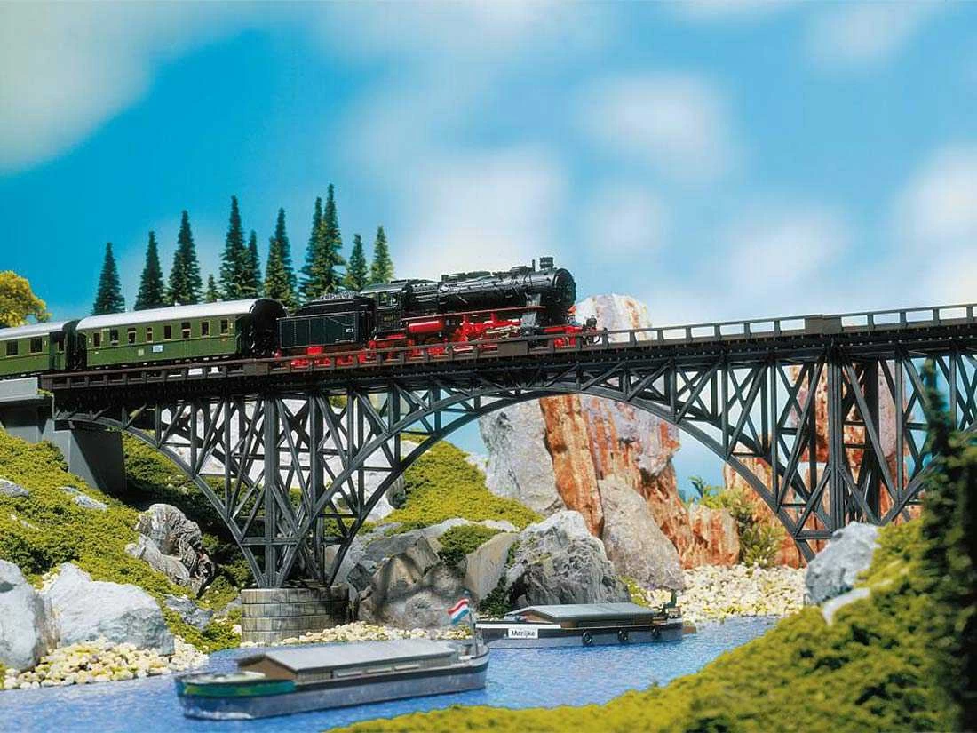 Modell: Spur H0. 355 mm lang, kpl. mit 2 geraden Gleisbetten. Die Trägerkonstruktion kann in zwei Varianten zusammengesetzt werden. Für alle Modellgleise verwendbar, außer Märklin C-Gleis. Gleisbetthöhe: 117 mm, abnehmbar auf 91 mm.