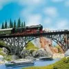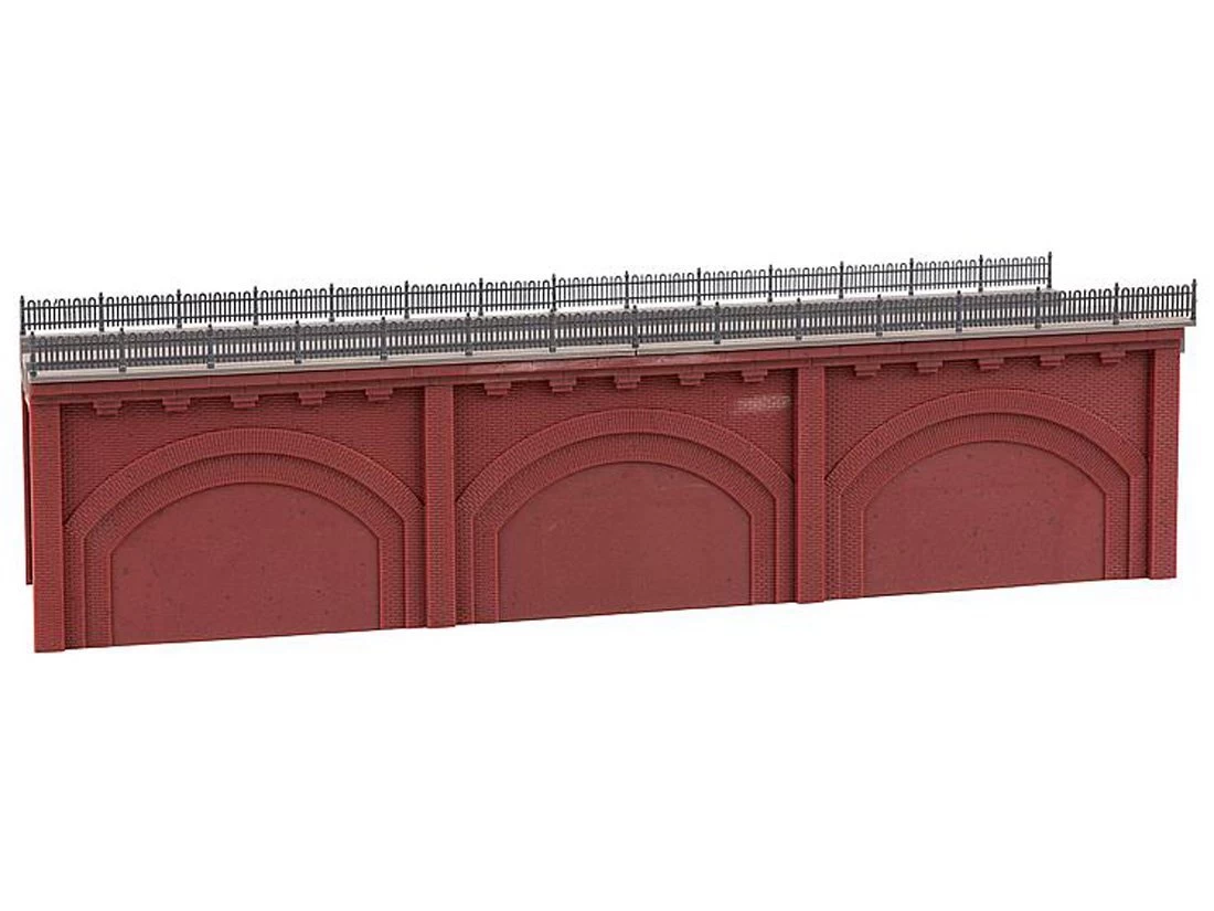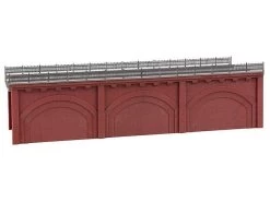 Modell: Spur H0. Nach dem Vorbild der Berliner und Wiener Stadtbahnbögen aus dem 19. Jahrhundert. Zweigleisiges Hochbahntrassen-Segment mit rötlicher Sichtziegel-Fassade und drei zugemauerten Viaduktbögen. Für alle Gleissysteme geeignet.