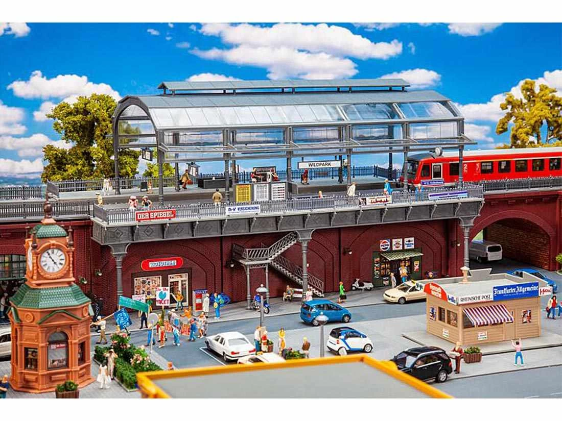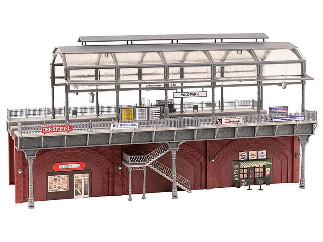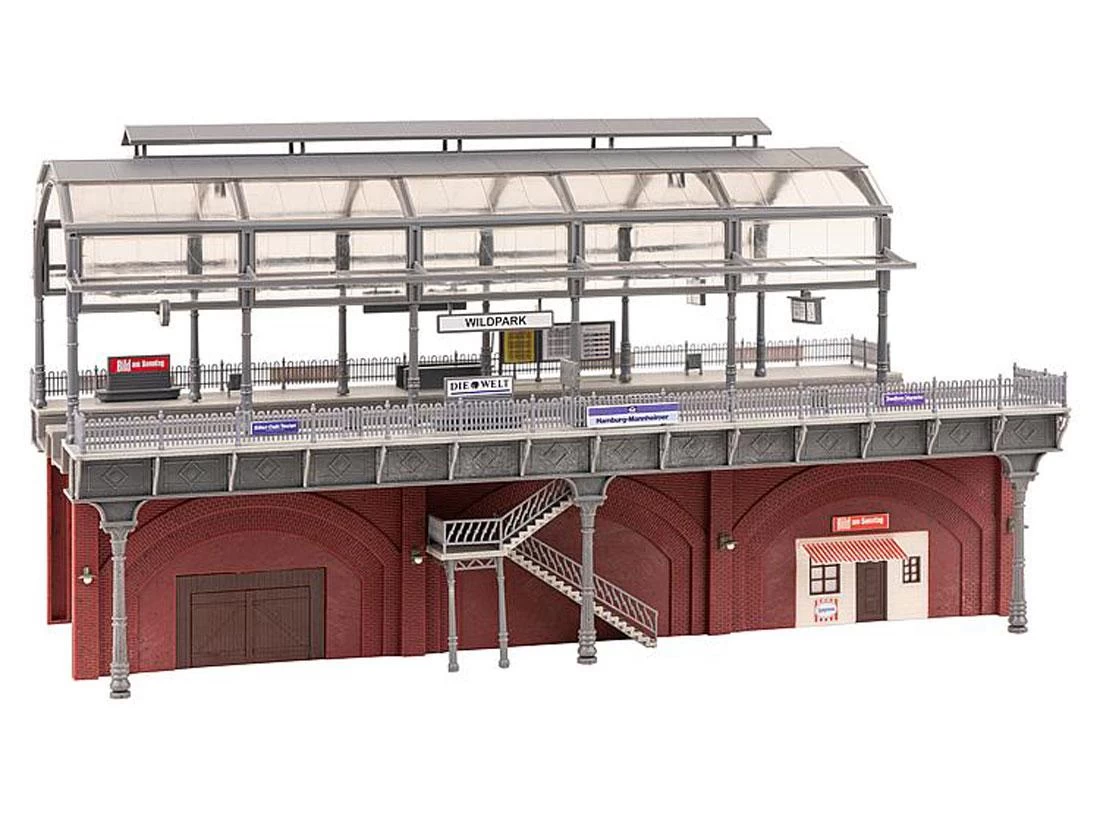 Modell: Spur H0. Hochlage! Auf drei Viaduktbögen trassierte, zweigleisige S-Bahn-Station mit seitlichen Treppenaufgängen, dekorativen Pfeilern, Kappen und Geländern aus Gusseisen sowie einem verglasten Tonnendach. Die Backsteingewölbe dienen Gewerbetreibenden zum Teil als Nutzfläche. Zur Ausschmückung liegen u. a. Infotafeln und Werbeplakate bei. Verlängerung des Modells durch Reihung möglich. Gleisbett für alle Gleissysteme geeignet.