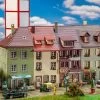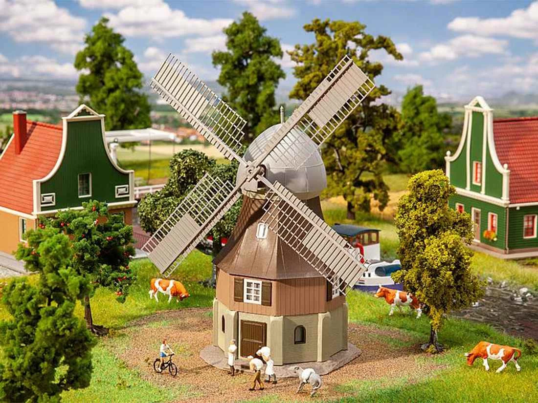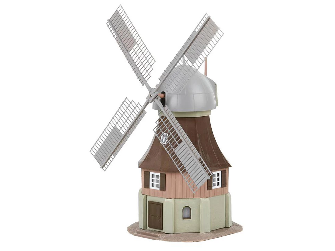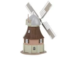Modell: Spur H0. Windenergie! Achteckige Holländerwindmühle mit einem gemauertem und aus Balken konstruierten Unterbau mit Fensterläden. Die großflächigen Flügel können mit dem beiliegenden Synchron-Bastelmotor, Art. 180629, 12-16 V, Wechselspannung angetrieben werden.