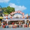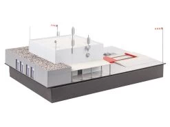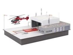 Modell: Spur H0. Rund um die Uhr einsatzbereit. Moderner LuftrettungsstĂŒtzpunkt fĂŒr Ambulanz- und RettungsflĂŒge, bestehend aus einem Hubschrauberhangar fĂŒr die Wartung und Einsatzvorbereitung, einem DienstgebĂ€ude mit Einsatzzentrale, Technik- und AufenthaltsrĂ€umen fĂŒr die Besatzung sowie einem Hubschrauber des Typs EC135. Zubehör fĂŒr die Ausgestaltung der Rettungsstation, wie eine fahrbare Plattform, WindsĂ€cke, Antennen und eine Tankanlage beiliegend. Bewegte Miniaturwelten. Clou des Modells sind verschiedene Bewegungsfunktionen, die den Einsatzablauf darstellen: bei BetĂ€tigung des beiliegenden Schalters öffnen sich die Hangartore, die Plattform samt Hubschrauber fĂ€hrt heraus und die RotorblĂ€tter des Helikopters beginnen sich zu drehen. Bei erneuter BetĂ€tigung laufen die RotorblĂ€tter aus und bleiben stehen. Entsprechend lĂ€sst sich die Plattform samt Hubschrauber zurĂŒck in den Hangar fahren und die Tore schlieĂen sich. Sind die Tore und die Plattform in Bewegung blinkt eine Warnlampe. Antriebsteile, Steuerung, drei Motoren und ein Schalter sind im Bausatzumfang enthalten. Der Anschluss erfolgt an 5 V DC.