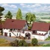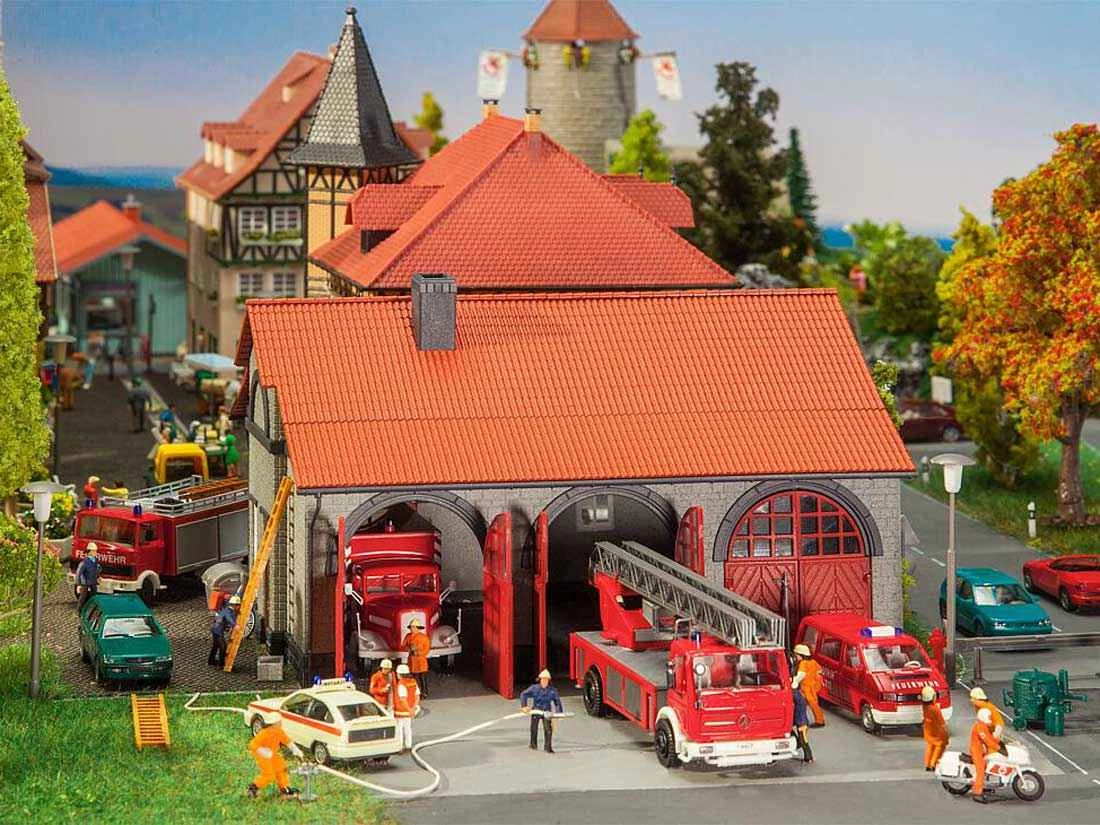 Modell: Spur H0. Massives Spritzenhaus ermöglicht die Unterstellung von Einsatzfahrzeugen und Gerätschaften oder auch die Nutzung als Werkstatt. In deutlichem Kontrast zur Naturstein-Fassade stehen drei rote Klapptore mit Rundbogeneinfassung. Ein weiteres Tor auf der Gebäuderückseite ermöglicht auch die Durchfahrt.