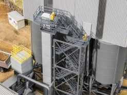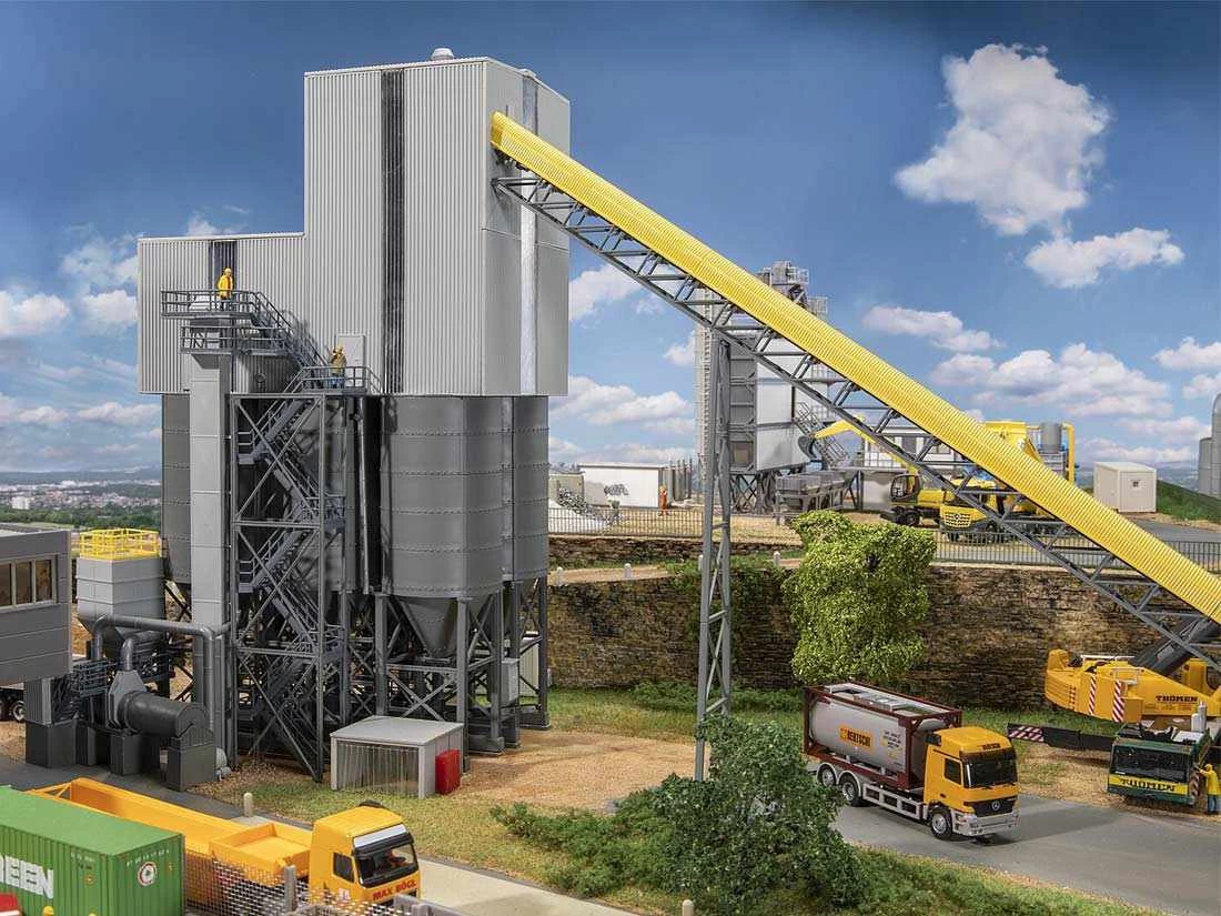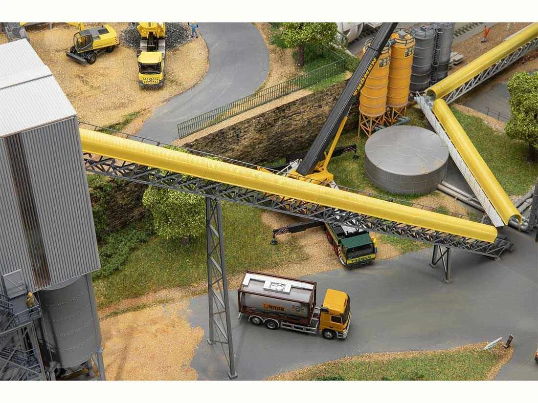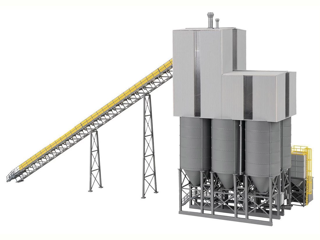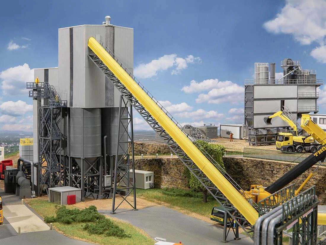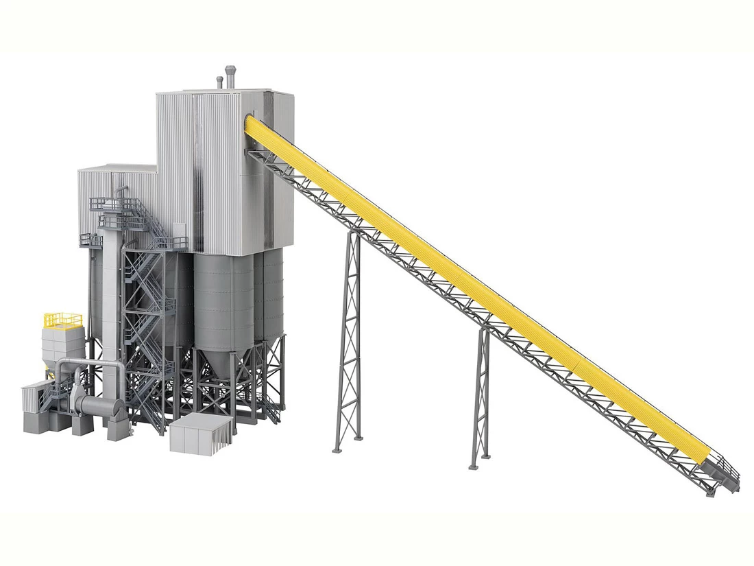 Modell: Spur H0. Großes Schotterwerk mit eingehauster Aufbereitungsanlage, sechs Speichersilos, Verladestraßen, einem Elevator, einem langen Förderband mit Abdeckhaube sowie verschiedenen Plattformen, Laufstegen und Treppen für die Arbeiter. Das Modell kann auch bei Tunnelbauprojekten zur Darstellung der Weiterverarbeitung des herausgebrochenen Gesteinsmaterials verwendet werden. Modell ohne Funktion.