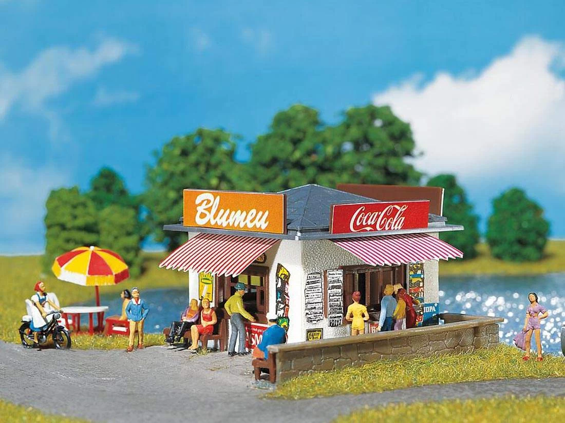 Modell: Spur H0. Kiosk mit Erfrischungen und Süßigkeiten. Dekobogen liegt bei.