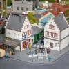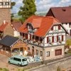 Modell: Spur H0. Mit oberschlächtigem, d.h. von oben angetriebenem Wasserrad. Diese Mühle kann mit richtigem Wasser betrieben werden. Der Bausatz enthält eine Spezial-Elektropumpe (12-16 V, Wechselspannung) und eine Bodenwanne. Die Pumpe wird in das Bergstück eingebaut; sie transportiert das Wasser aus der Wanne in die Wasserrinne. Von dort fließt das Wasser über das Mühlrad, treibt es an und läuft in die Bodenwanne zurück. Somit befindet sich das Wasser in einem ständigen Kreislauf.