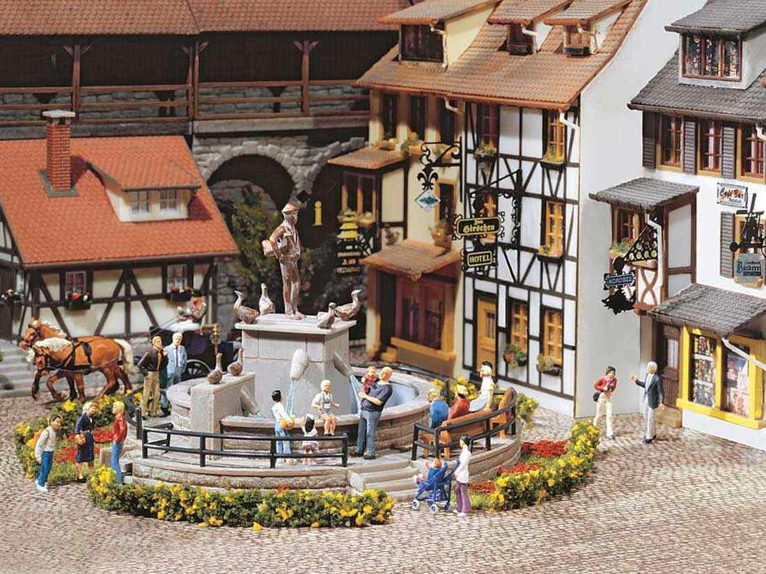 Modell: Spur H0. Attraktiver Mittelpunkt für Stadt- oder Dorfplätze. Der Brunnen kann mit der Wasserpumpe (Art. 180627) direkt betrieben werden, wenn ein Wasserbehälter unter dem Brunnen befestigt ist. Wird kein Wasser verwendet, sollte der Boden des Brunnens mit Seefolie (Art. 170791) realistisch gestaltet werden.