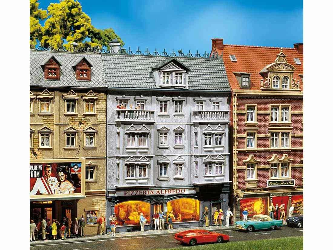 Modell: Spur H0. Renoviertes Stadthaus mit zwei Erkern und Pizzeria im Erdgeschoss.