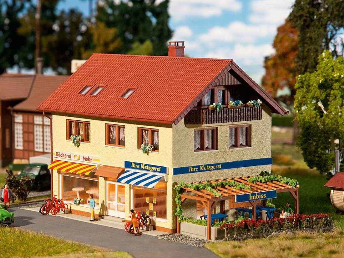 Modell: Spur H0. Für alle mit gutem Geschmack. Metzgerei und Bäckerei als eingerichtete Ladengeschäfte in einem zweistöckigen Wohnhaus. Durch die großen Schaufenster erblickt man die Warenauslage und ein Snack am Stehtisch unter der berankten Pergola lädt zum kurzen Zwischenstopp ein. Zum Zubehör gehören zudem Fahrräder und passende Fahrradständer.