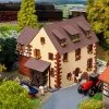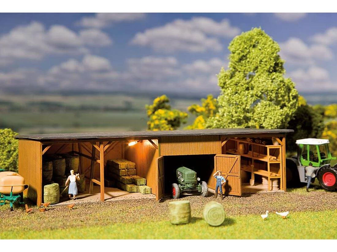 Modell: Spur H0. Überdachter Lagerschuppen für die trockene Einlagerung von Heu- und Strohballen mit offener, komplett eingerichteter Werkstatt und Fahrzeuggarage (Tore sind zu öffnen). Heuballen und andere typische Zubehörteile für die Werkstatt liegen bei. Dieses Gebäude darf auf keinem Bauernhof fehlen.