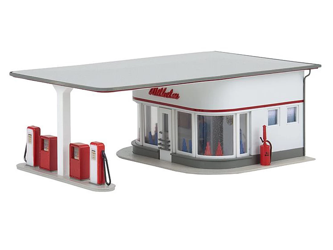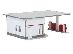 Modell: Spur H0. Kleine Tankstation mit Flachdach in Anlehnung an Originalvorbilder in Friedrichshafen und Tettnang. Grundriss und Fensterband des Kassenraums sowie die weit vorgespannte, schlanke Kragplatte, die die Tankinsel mit zwei Zapfsäulen überdacht, sind im klassischen Design der 50er-Jahre abgerundet. Der signalrote Reklameschriftzug und ein umlaufender Kontraststreifen akzentuieren die weiße Putzfassade.