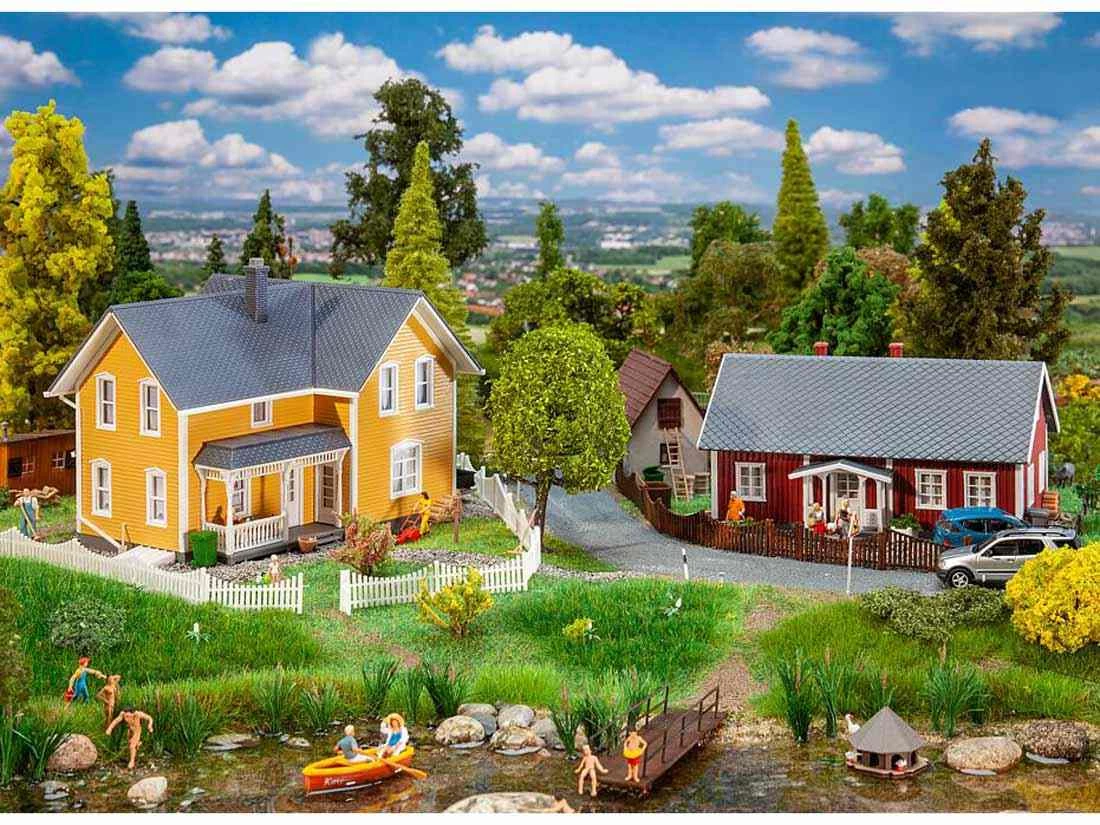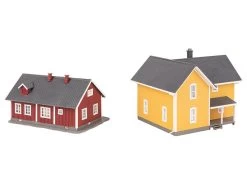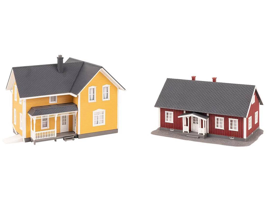Modell: Spur H0. Schwedisch! Set bestehend aus einem einstöckigen Wohnhaus in roter Farbgebung mit Vordach, weißen Giebelfenstern und Schieferdach sowie einem zweistöckigen, gelben Wohnhaus mit mittigen Hausanbau. Der seitliche Hauseingang ist überdacht und auf der Rückseite des Gebäudes befindet sich eine typisch schwedische Eingangsveranda.