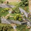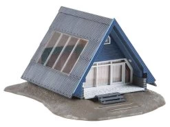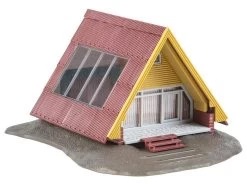 Modell: Spur H0. Feriensiedlung bestehend aus drei zeltförmigen Nurdachhäusern unterschiedlicher Farbgebung, jeweils mit großem Dachfenstern und Bodenplatten mit Stufen zu den kleinen Terrassen. Als passende Ergänzung empfohlenes Zubehör: Gebäude-Inneneinrichtung, Art. 180545 und Büroeinrichtung, Art. 180454.