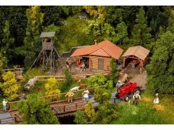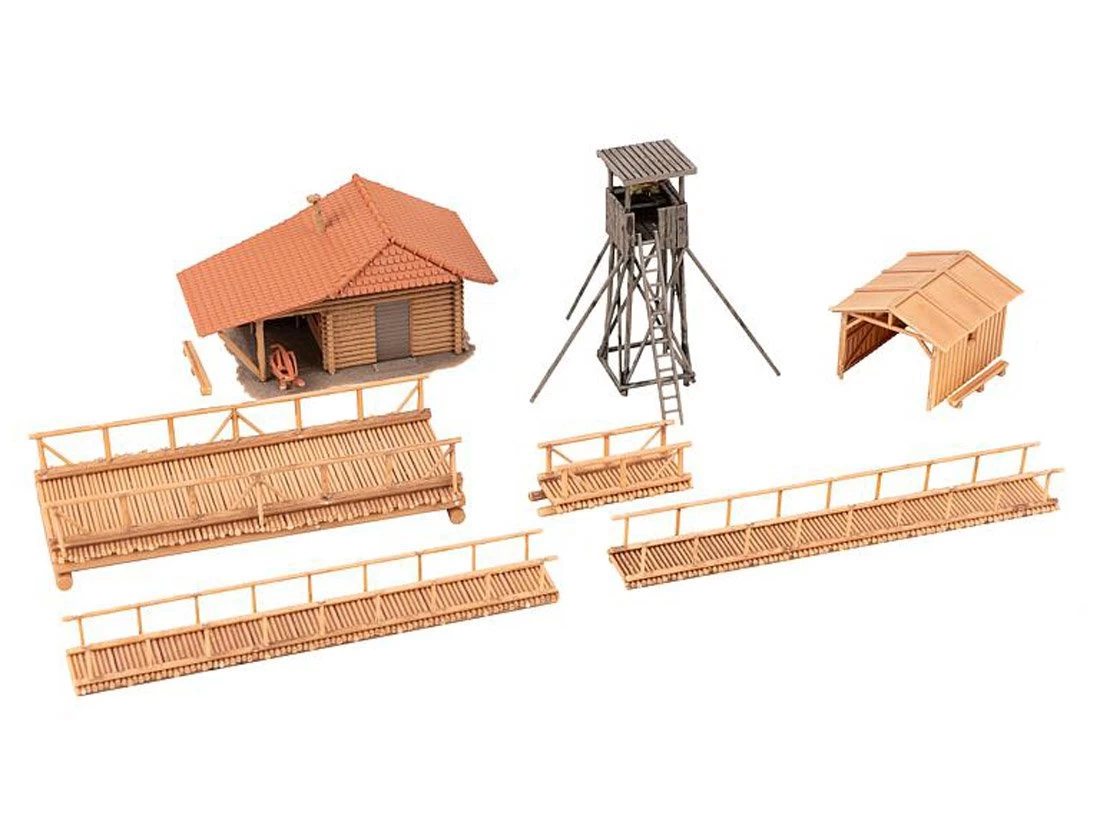 Modell: Spur H0. Für Naturfreunde. Ausgestaltungs-Set bestehend aus einem kleinen Blockhaus, einer Wanderschutzhütte, einem Hochsitz, einer Holzbrücke, drei Holzstegen und Zubehör, wie Schubkarre, Säge und Axt.