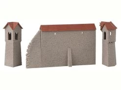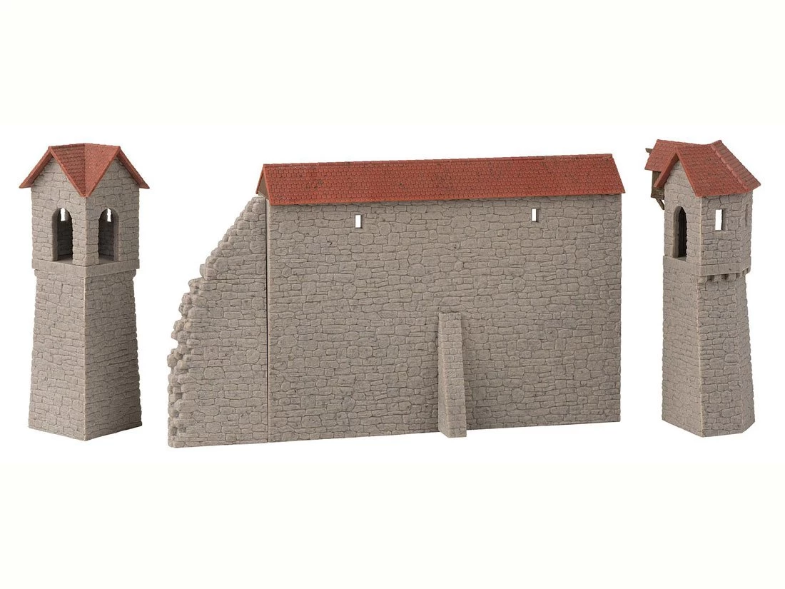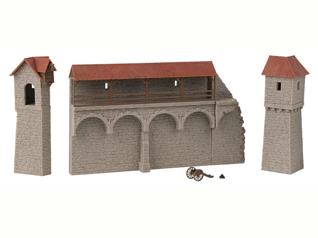 Modell: Spur H0. Modulares Modell-Set bestehend aus einem teilverfallenen Altstadtmauer-Element mit Rundbögen und gedecktem Wehrgang, zwei Wehrtürmen und einer historischen Kanone, die wahlweise als Feld- oder als Festungskanone gebaut werden kann. Variable Anordnung und Kombinationsmöglichkeit mit allen weiteren Elementen der Faller Altstadtmauer-Serie.