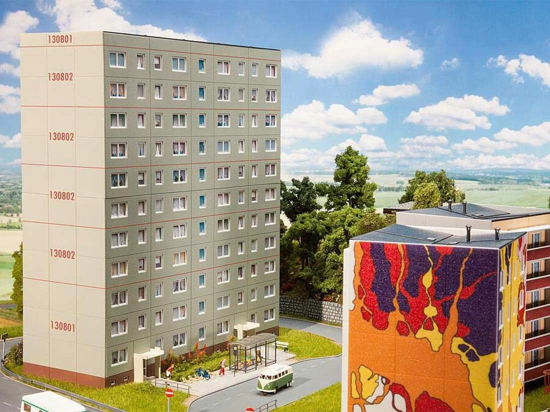 Modell: Spur H0. Industrieller Wohnungsbau im Baukastensystem. Set mit zwei ergänzenden Stockwerken (Wandplatten und Balkone, Fenster, Deko-Maske) des Plattenbautypus P2, passend zum Artikel Plattenbau P2 Basispackung (Art. 130801). Bitte beachten Sie, dass ein Gebäudesockel und ein Dach nicht zum Bausatzumfang gehören.