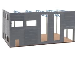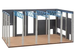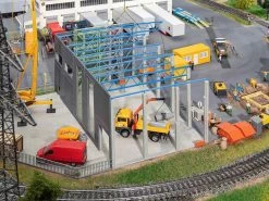 Modell: Spur H0. Bauen mit System. Im Aufbau befindliche Produktions-, Speditions- oder Lagerhalle. Zwei WĂ€nde mit Tor- und Fensteraussparungen, die StĂŒtzen und das Tragwerk sind bereits errichtet. Bodenplatte beiliegend. Kompatibel und erweiterbar mit Systemelementen der Faller Goldbeck-Serie.