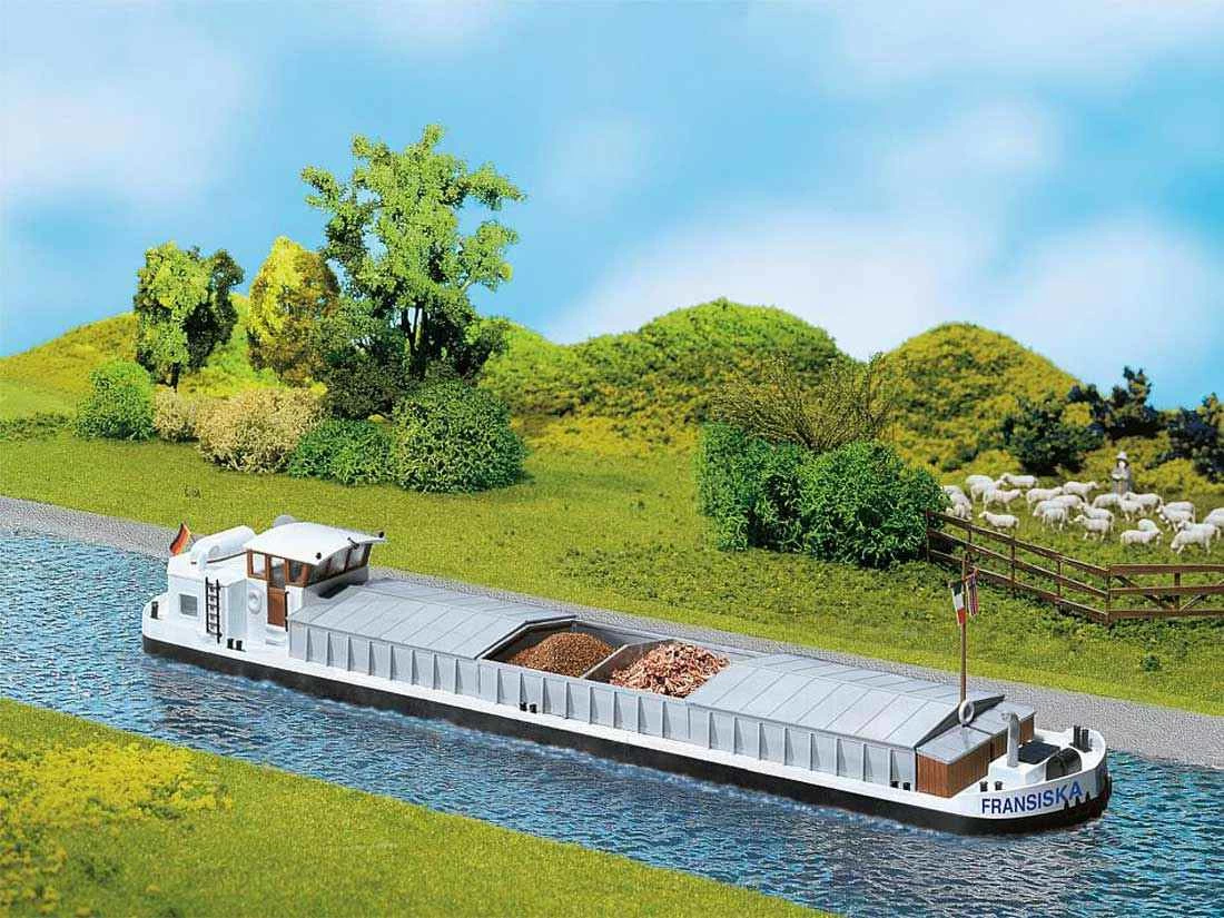 Modell: Spur H0. Ein Flussfrachtschiff wie es im Transportgewerbe auf den Binnenflüssen unterwegs ist. Abgedeckte Ladeluken, Steuerhaus und angebaute Wohnkajüte. Abgeflachter Rumpf. Nicht schwimmfähig.