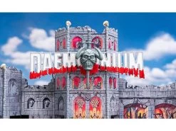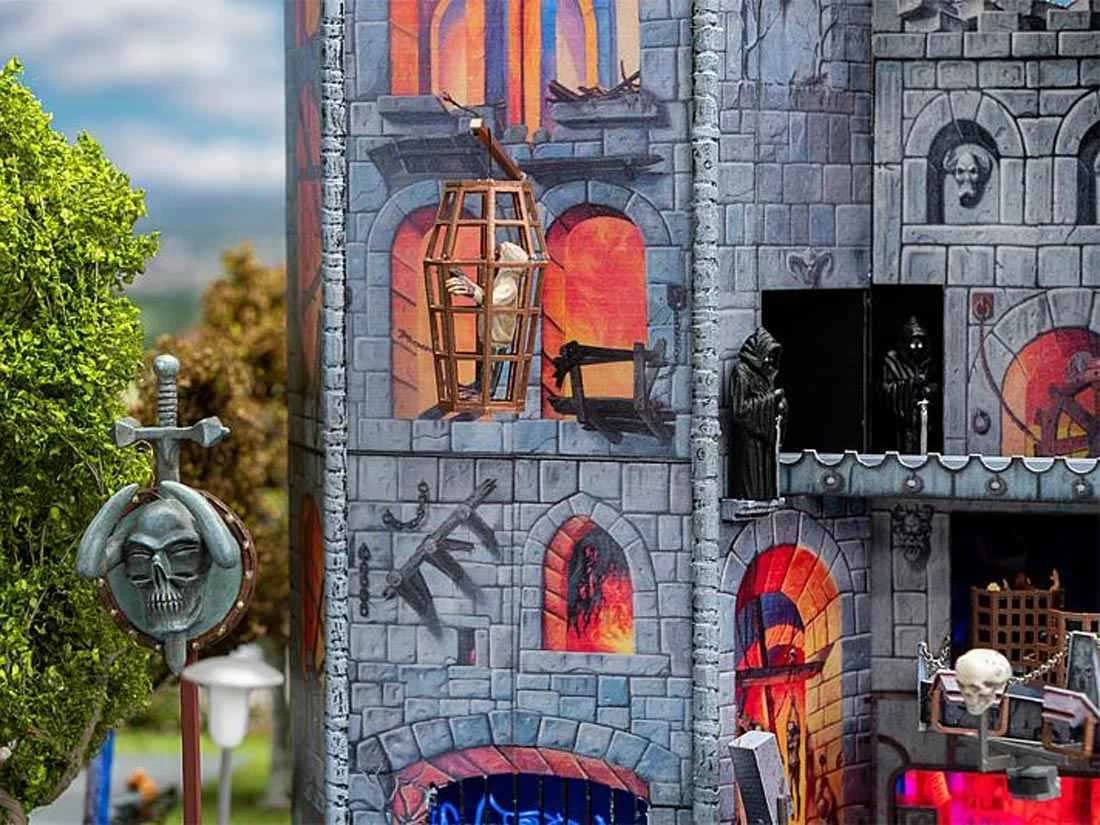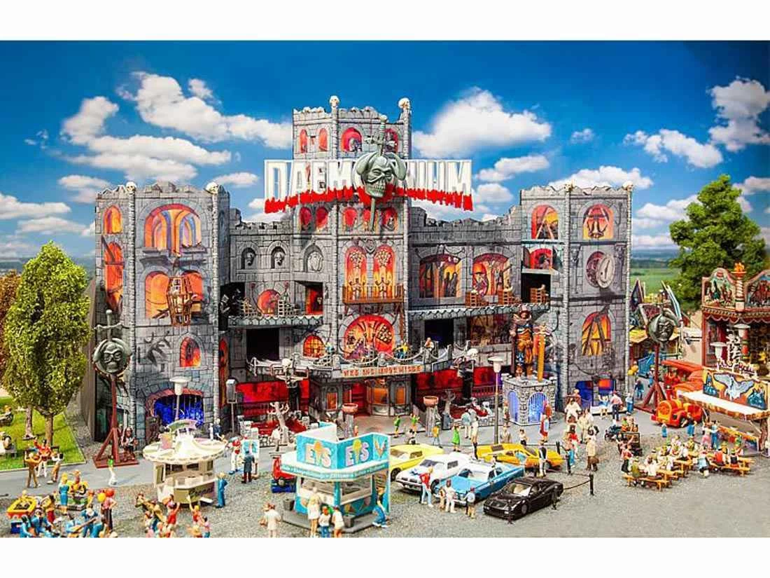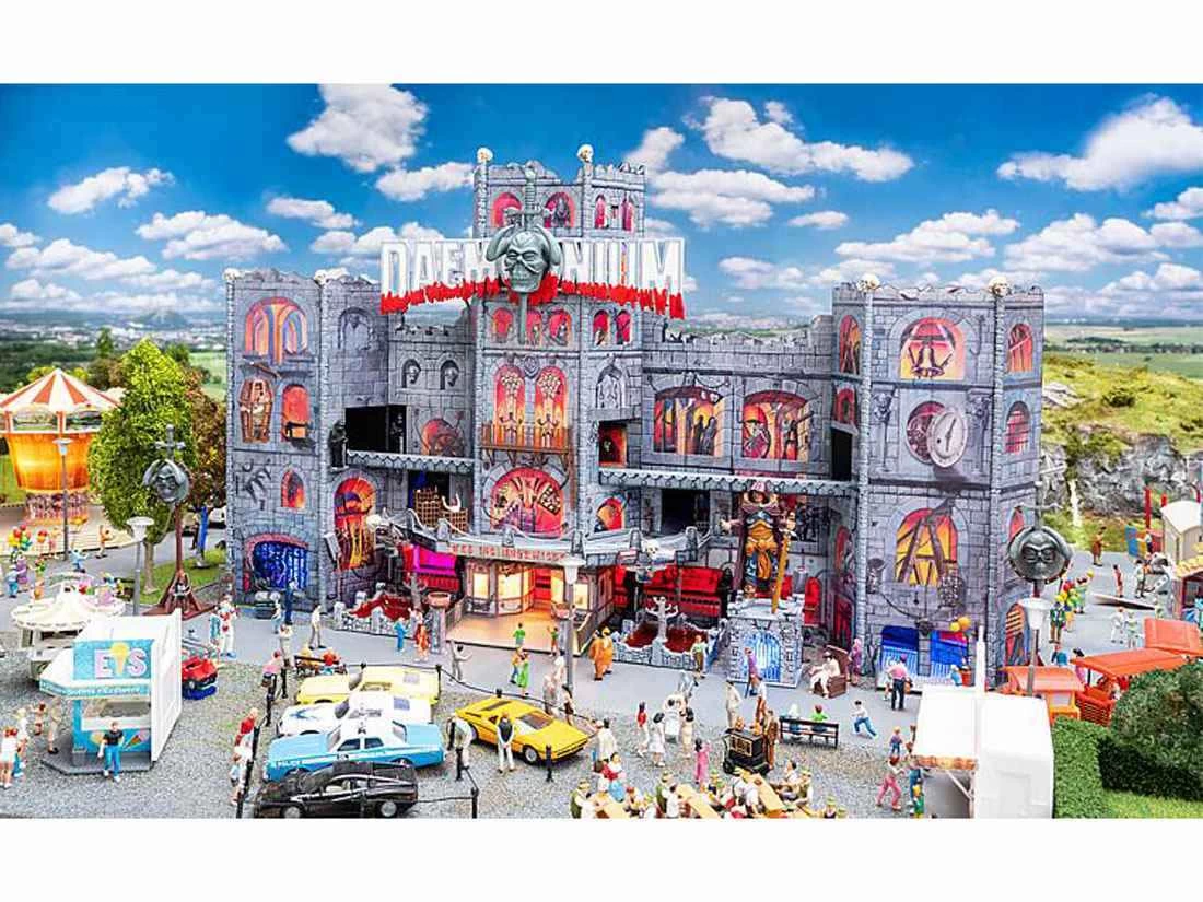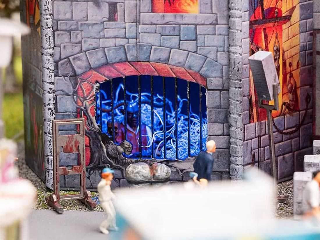 Modell: Spur H0. Gruselspektakel im XXL-Format. Digital bedrucktes Funktionsmodell einer großen, mobilen 3-Fahrebenen-Geisterbahn nach dem Originalvorbild Daemonium des Schaustellers Martin Blume, einem Fahrgeschäft-Bau des Unternehmens Mack. Die eingleisige Fahrt führt in käfigähnlichen Gondeln durch eine bizarre Folterkammer der Inquisitionszeit. Die Dekorationsmalerei der burgartigen Fassade (Art Studio Bernhardt), der bewegte Schriftzug und die fantasievoll gestalteten Figuren im Außenbereich zeigen aufwendige Gruselszenarien. 4 Motoren enthalten. Gondeln nicht drehbar.