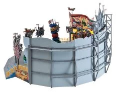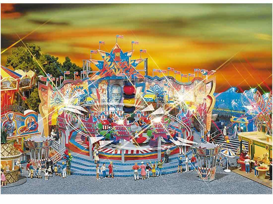 Modell: Spur H0. 16 bunte Gondeln auf 4 Drehtellern wirbeln wild im Kreis herum. Mit Kassenhaus und farbenprächtiger Hintergrunddekoration. Komplett mit Motor (12-16 V, Wechselspannung). Mit Art. 180647 + 180671 nachträglich interessant beleuchtbar.