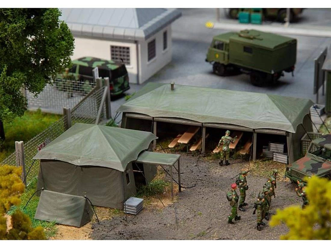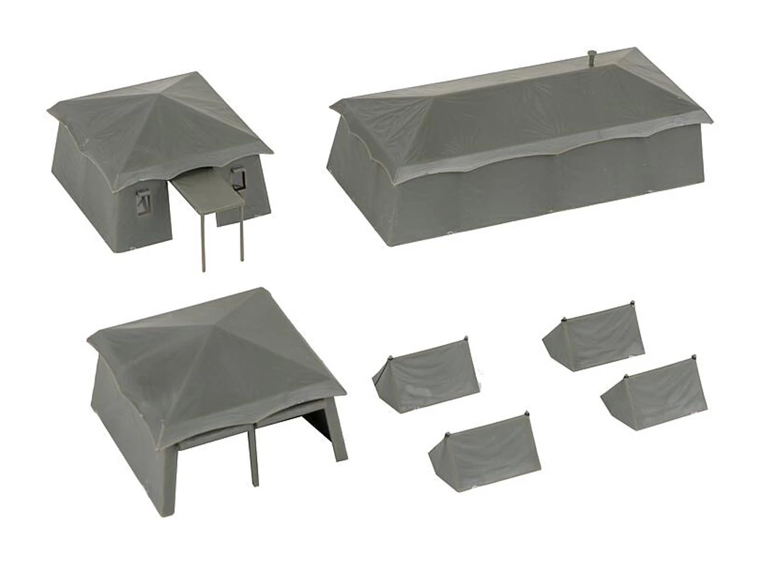Modell: Spur H0. Ausstattungs-Set mit sieben olivgrünen, unbedruckten Zelten in unterschiedlichen Größen und Ausführungen.