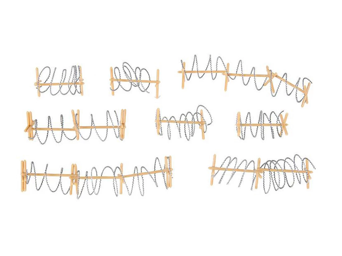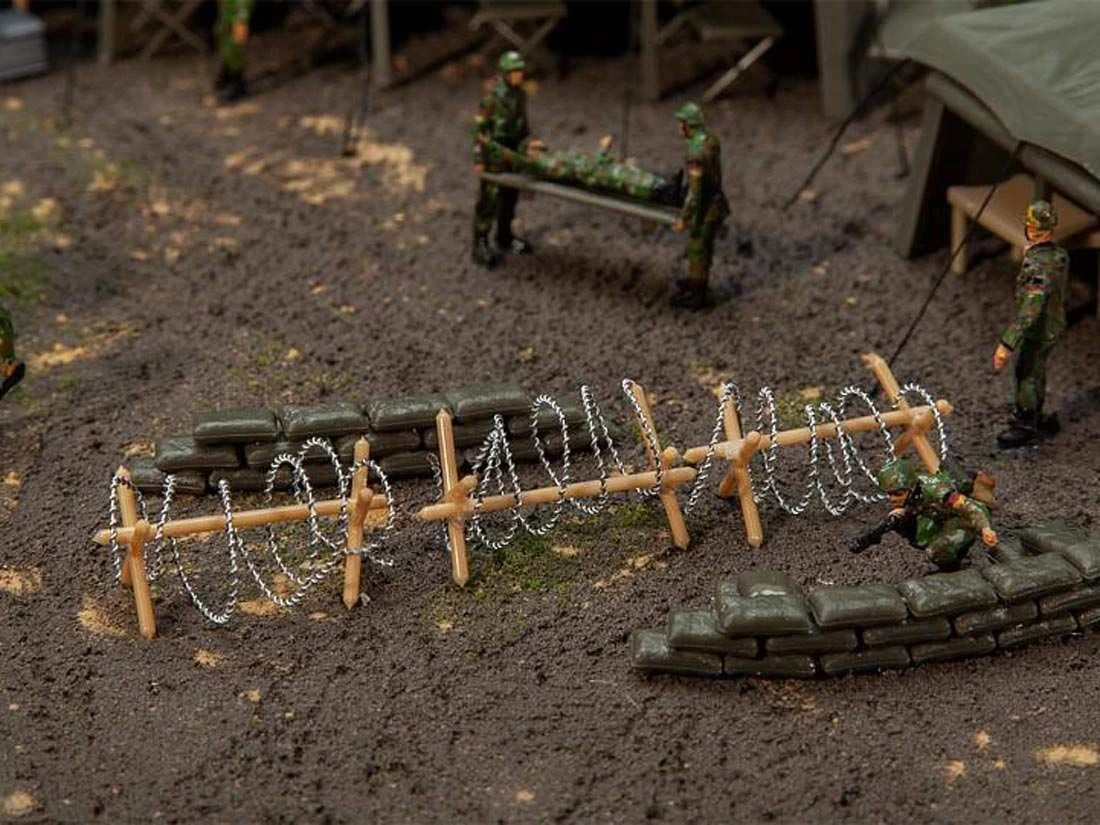 Modell: Spur H0. Ausstattungs-Set mit 15 mobilen, mit Stacheldraht verstärkten Spanische Reiter-Barrieren.