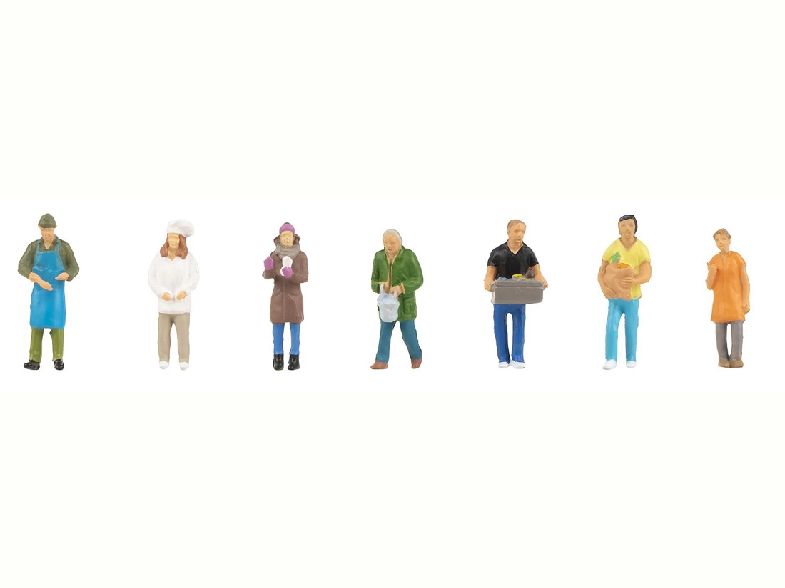 Modell: Spur H0. Figuren Wochenmarkt II. Modelle aus Kunststoff, farblich gestaltet.