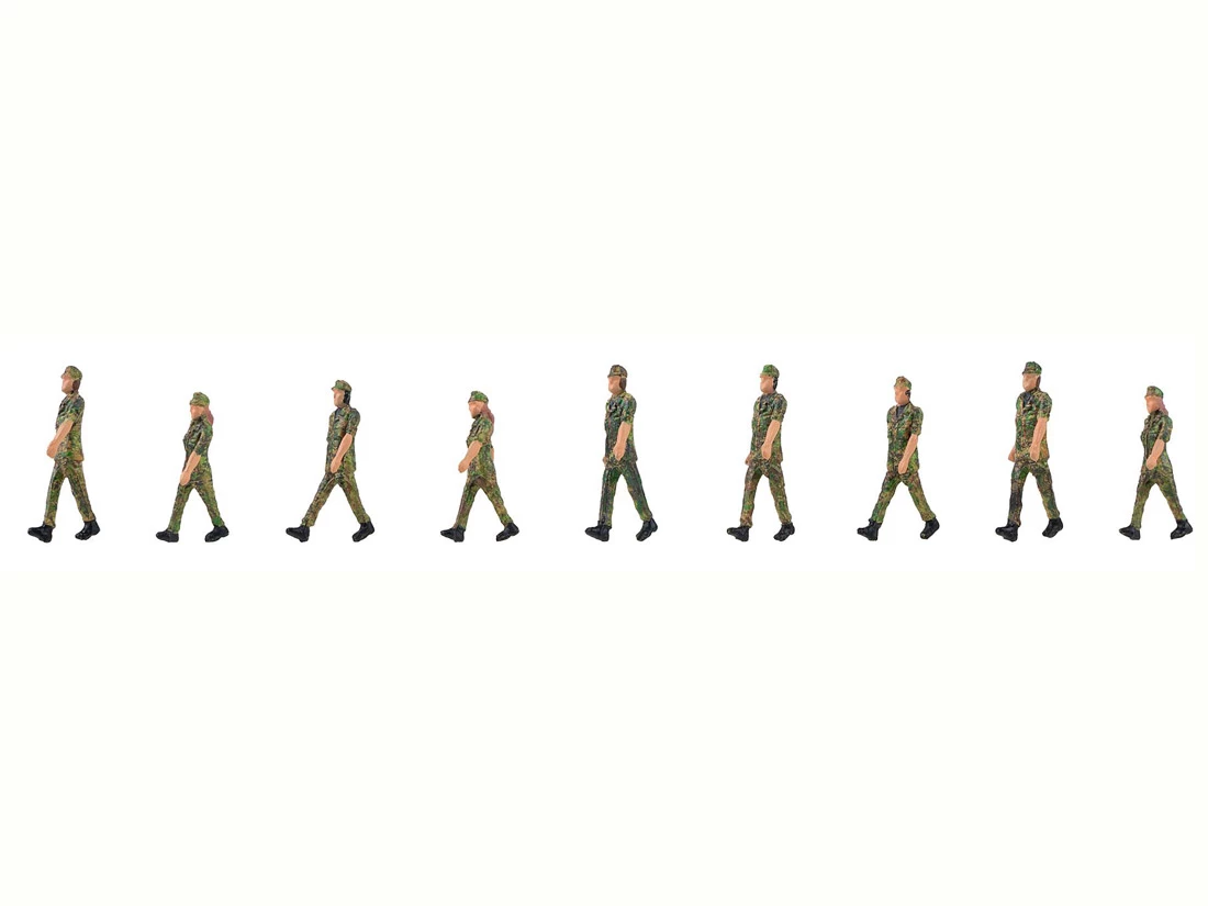 Modell: Spur H0. Figuren Soldaten im Gleichschritt. Modelle aus Kunststoff, farblich gestaltet.
