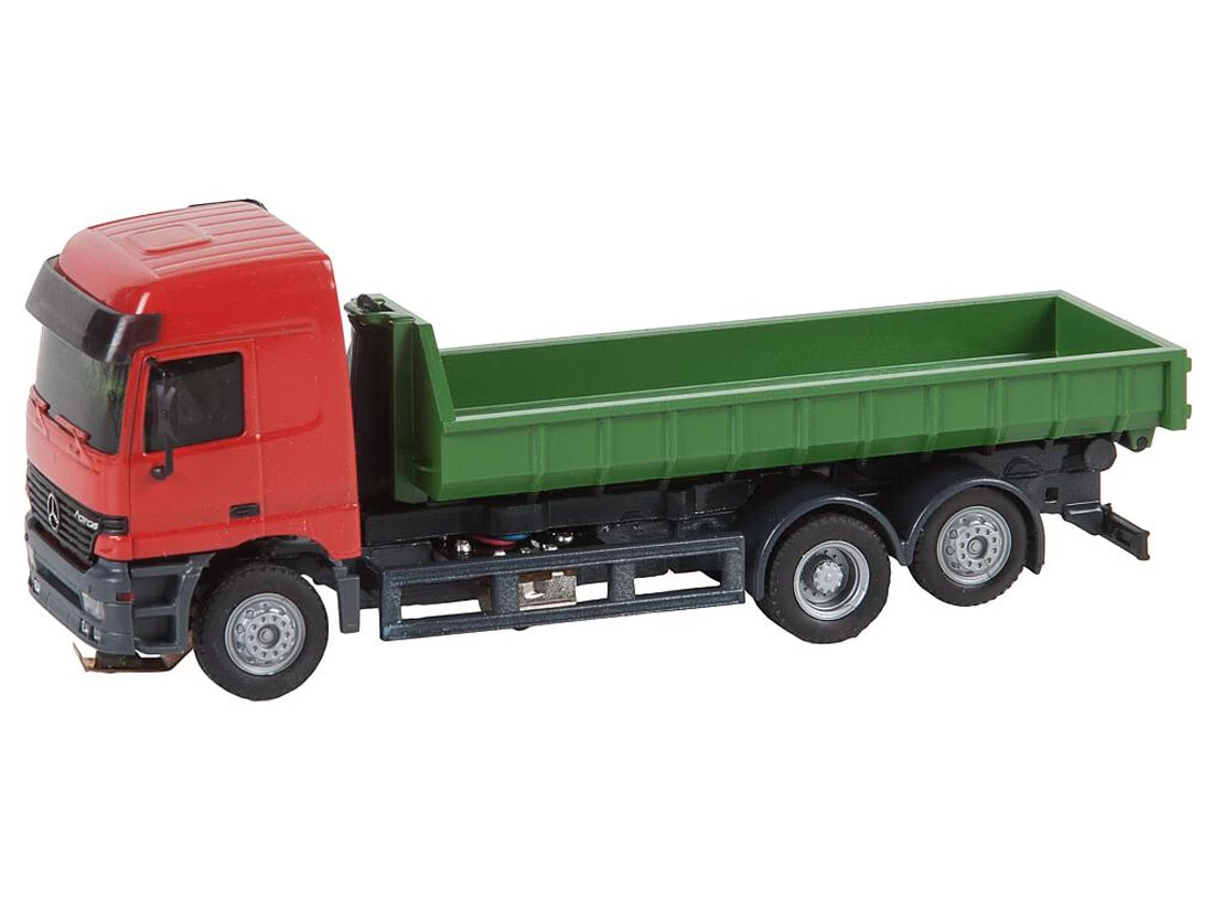 Modell: Spur H0. Mercedes Benz Actros L. Modelljahr des Originals: 2002. Der Actros wurde 1996 vorgestellt und wird seitdem in verschiedenen Varianten gebaut. Das Modell hat einen Hakenliftaufbau und ist mit einer leeren, niedrigen Abrollmulde beladen.
