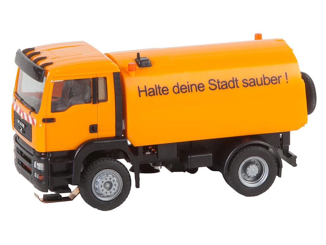 Modell: Spur H0. Das MAN TGA-Fahrgestell wurde im Jahr 2000 vorgestellt und 2007 vom TGX abgelöst. Das Modell ist mit einem Kehrmaschinenaufbau ausgestattet sowie rechts mit Kehrbesen ohne Funktion. Die Rundumkennleuchten auf dem Aufbau sind Attrappen.