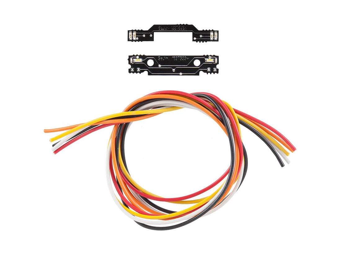 Modell: Spur H0. Lichtfunktionen für Ihre Car System Digital-Fahrzeuge. Das Beleuchtungs-Kit enthält zwei mit LEDs bestückte Platinen für die Fahrzeugbeleuchtung der LKW-Modelle MB SK und MAN F2000. Die angepassten Positionen der Befestigungsbohrungen und der LEDs ermöglichen die direkte Befestigung der Platinen an den Stoßstangen der Fahrzeugmodelle. Im LED-Beleuchtungs-Kit enthalten sind: – Frontplatine mit Scheinwerfern und Fahrtrichtungsanzeigern – Heckplatine mit Rücklichtern und Fahrtrichtungsanzeigern – Kabel-Set Verwenden Sie für den Umbau von herkömmlichen Car System-Modellfahrzeugen für den Car System Digital-Betrieb das Umrüstkit Analog-Digital, Art. 163701.