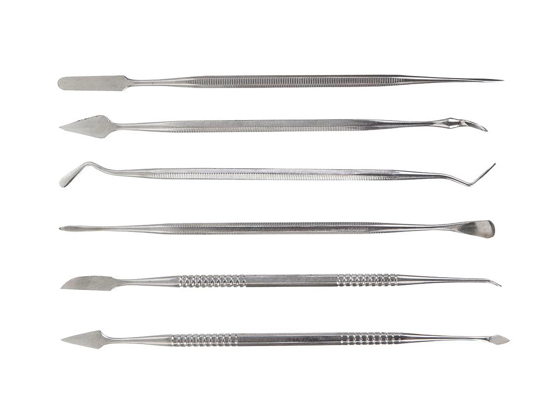 Für Modellierarbeiten in der Hobbywerkstatt. Set bestehend aus 6 Doppel-Spateln mit 12 unterschiedlich geformten Enden und Spitzen für verarbeitende, formende und abtragende Modellierarbeiten. Jeder Spatel ist aus rostfreiem, gehärteten Edelstahl gefertigt und bietet durch den geriffelten Griff einen perfekten Halt.