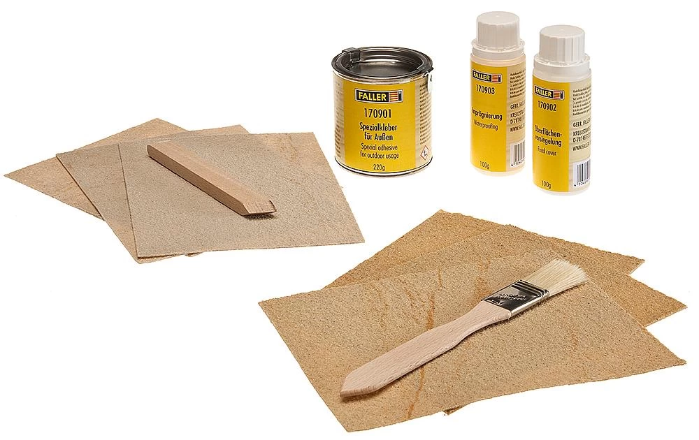 Das Komplett-Set zur Gestaltung von Natursteinmauern für den Außenbereich. Das Set beinhaltet alles was Sie für die Verkleidung einer Brücke, Wand oder eines Viadukts brauchen. Zunächst werden die beigelegten Natursteinmatten in die gewünschte Form geschnitten. Dann werden die einzelnen Teile mit dem Neoprenkleber angebracht. Jetzt kann das Kunstwerk mit dem Oberflächensiegel fixiert werden. Abschließend kann die Oberfläche mit der im Set enthaltenen Imprägnierung für den Außeneinsatz versiegelt werden.;