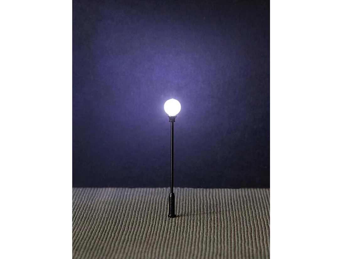Modell: Spur H0. Klassische Kugel-Aufsatzleuchte. Geeignet zur Beleuchtung von Altstädten, Parks und historischen Szenerien. Die Kugelleuchte ist mit langlebiger LED-Technik ausgestattet. Der Mast ist aus Metall gefertigt und die Leuchtenhöhe variabel einstellbar. Höhe: 71 mm. Lichtfarbe: kalt weiß Das Produkt ist anschlussfertig für 12 V Gleichspannung (DC). Nutzen Sie für den Betrieb der Leuchte den Transformator, Art. 180641.